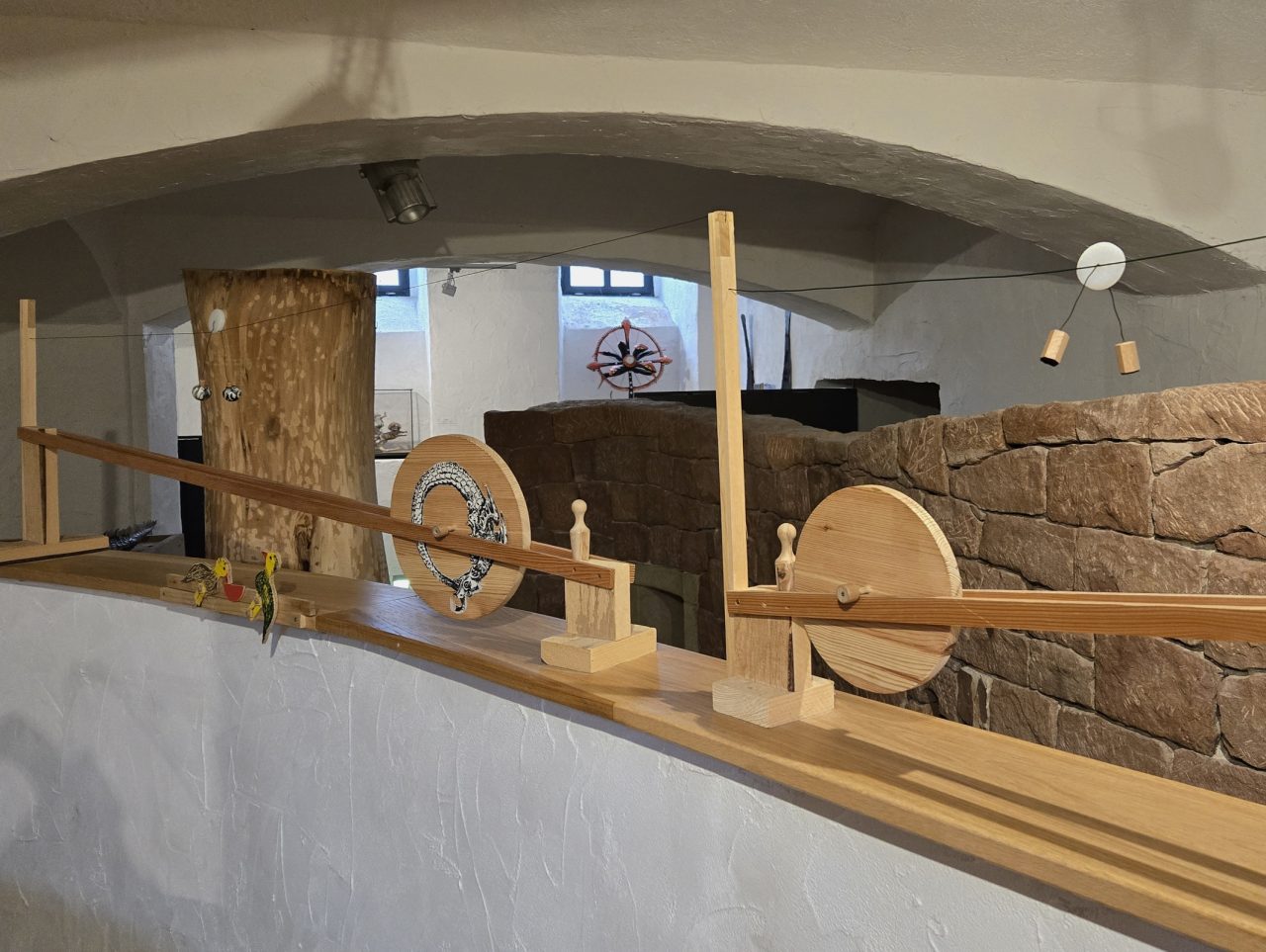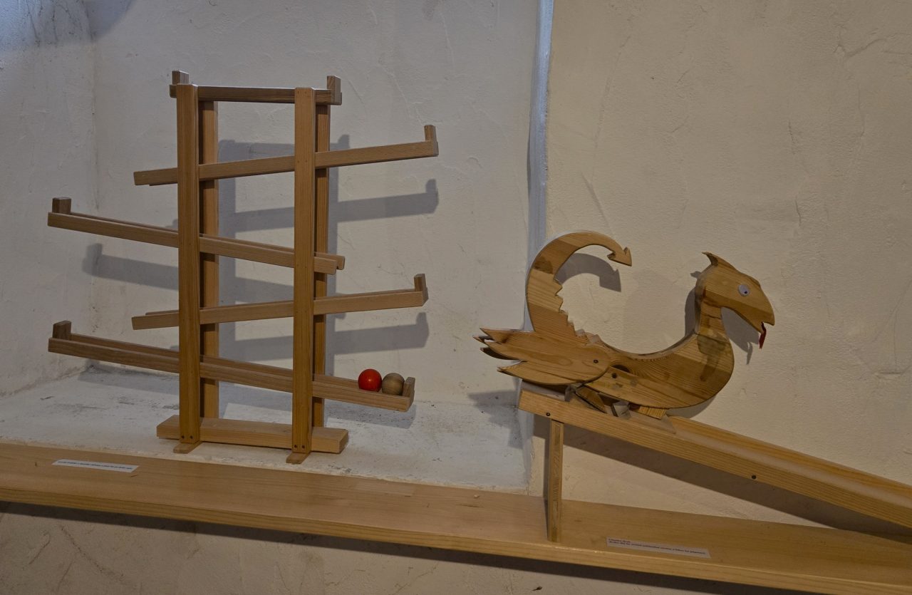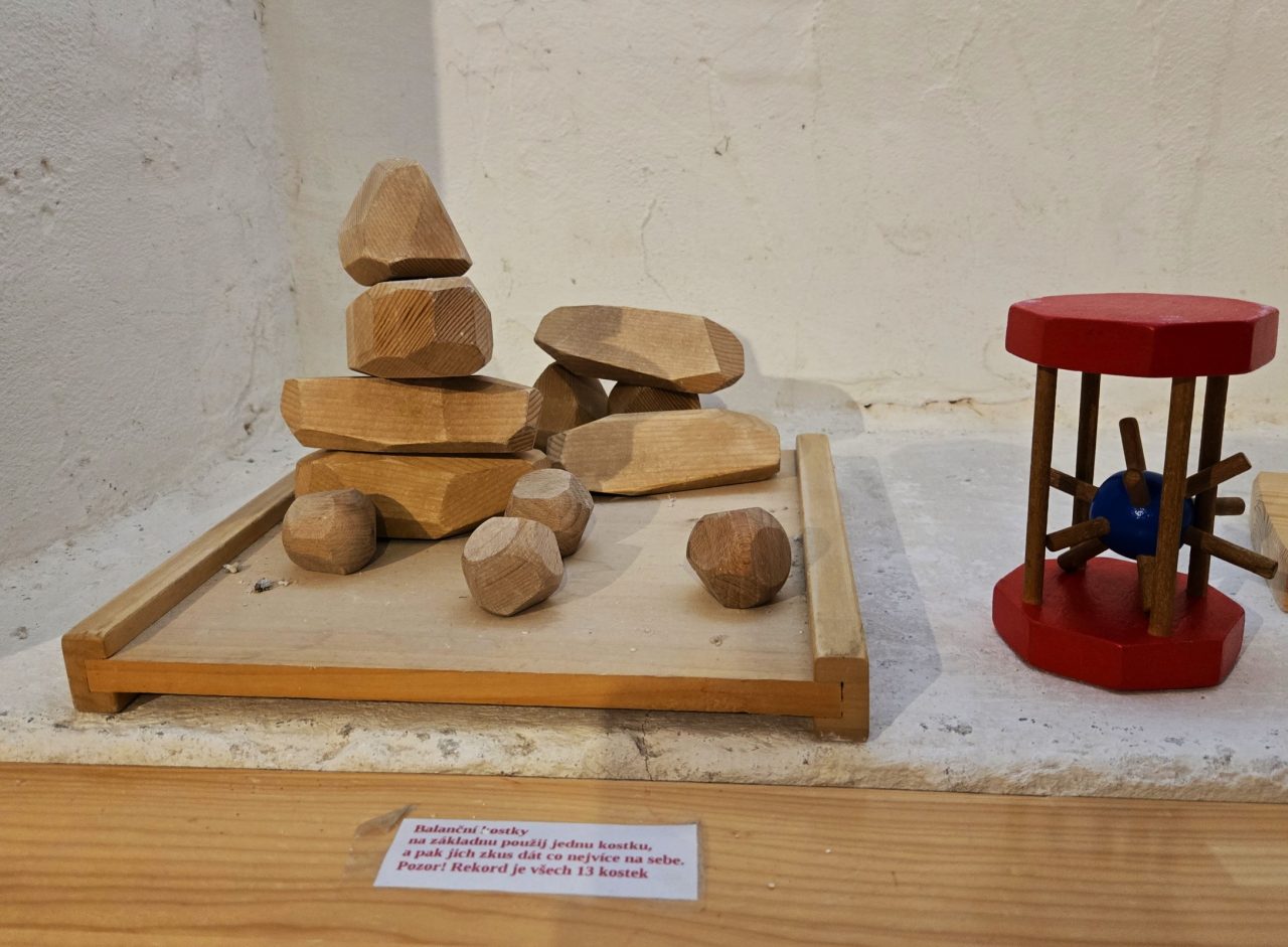 Podél stěn jsou hračky pro nejmenší děti. Pokud totiž ještě neumí pronikat do dalších tajů galerie, pak právě pro ně je to ideální místo. Vyzkoušet si tu mohou dřevěné mechanické hračky, které většinou jen jednoduše rozhýbou klikou.