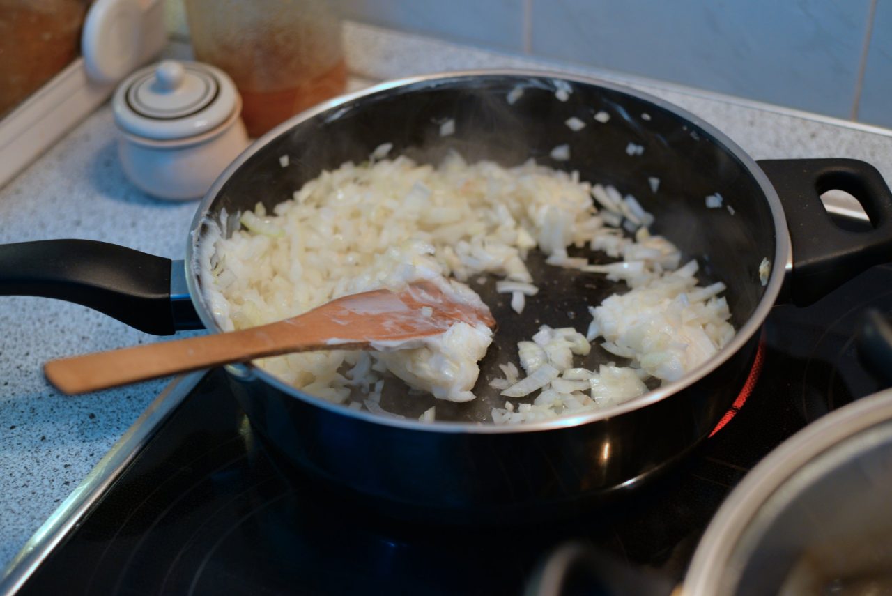 Cibuli nakrájíme na drobné kostičky a orestujeme do červena na pánvi se sádlem.