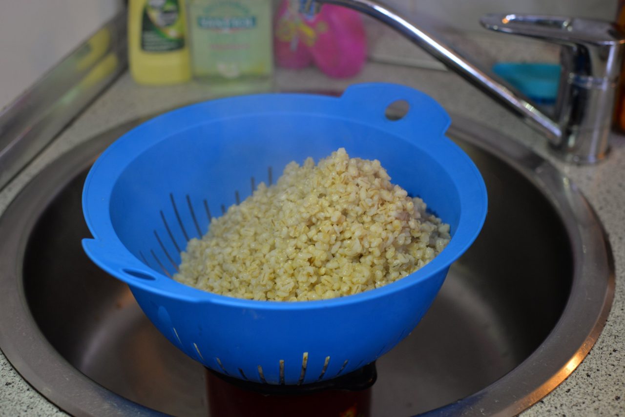 V jednom hrnci si předem namočíme ve vodě kroupy, které následně uvaříme doměkka.