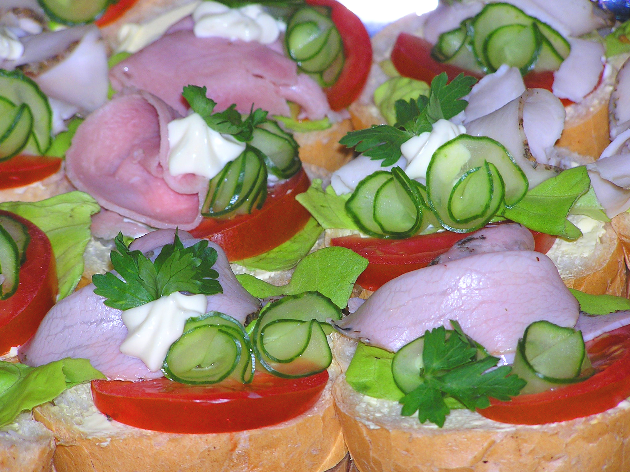 Postup: Rohlíky nakrájíme na kolečka, potřeme máslem a kečupem nebo hořčicí, obložíme kouskem šunky, kolečkem vařeného vejce a zdobíme zelenou petrželkou.