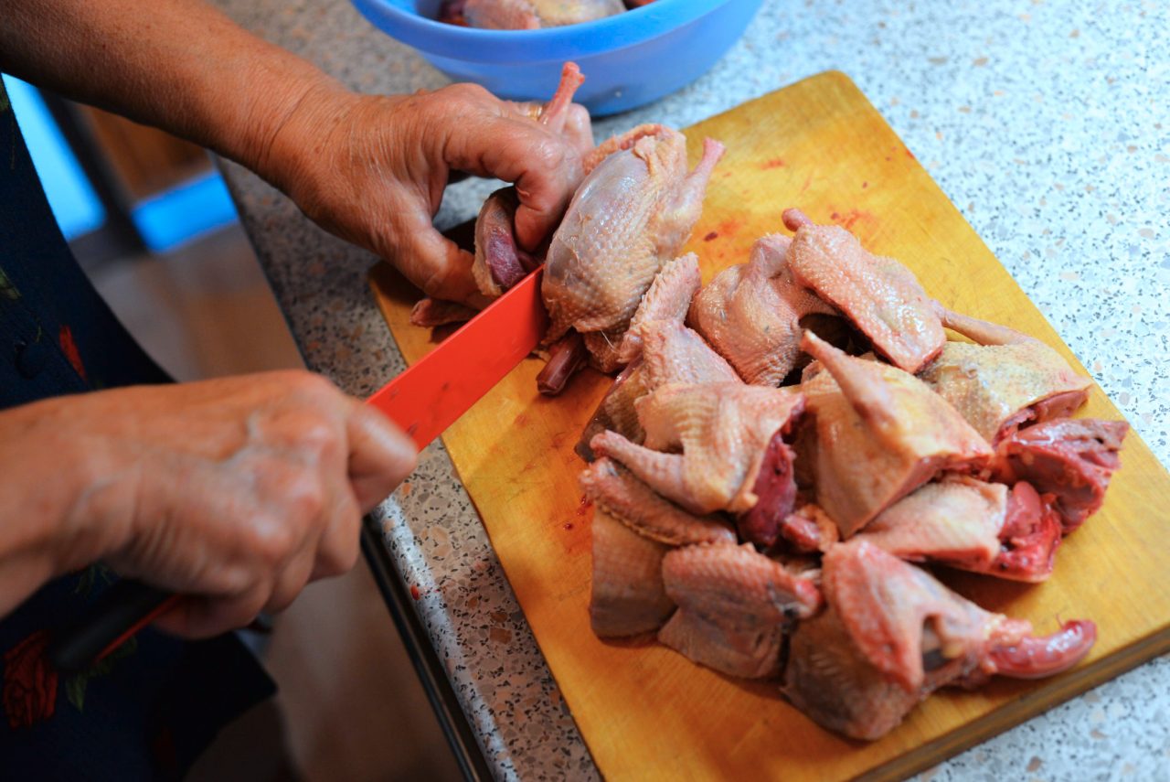 Holoubata vykucháme, umyjeme, naporcujeme na čtyři díly (podélně a pak nad stehýnkem).