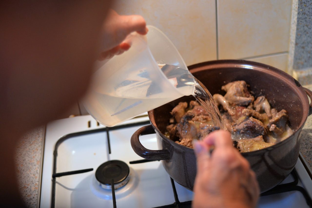 Do kastrolu dáme 2 dcl oleje, vložíme maso a restujeme, osolíme, opepříme a dáme trochu muškátového květu. Maso necháme zatáhnout. Pak přidáme 5 lžic hladké mouky a opražíme, abychom mohli nalít vodu a zadělat jíšku. Maso i s jíškou pomalu provaříme a před úplným změknutím masa – tedy po 75-90 minutách – přidáme játrové knedlíčky.