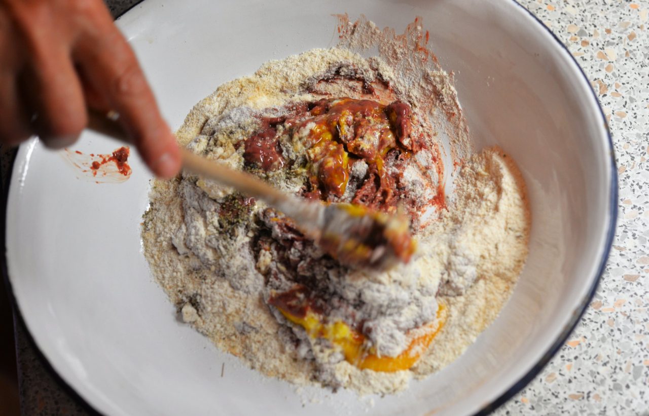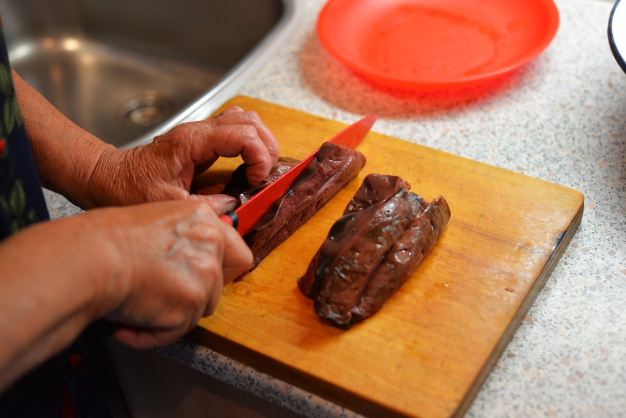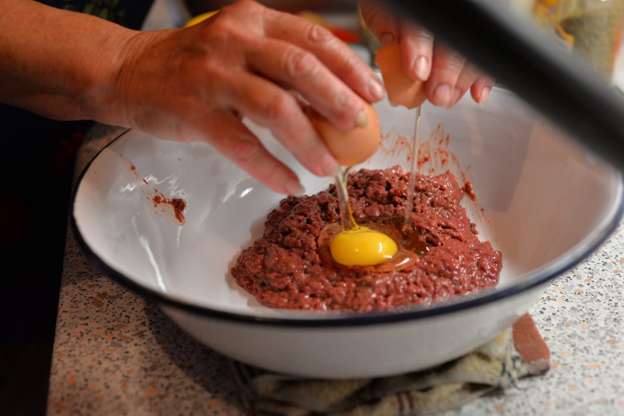 Játra nameleme najemno, přidáme vajíčko, sůl, pepř, majoránku, česnek, strouhanku i mouku, vše zamícháme a necháme chvíli odpočinout.