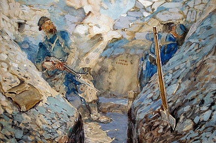 Patrně opravdu potíže se žlučníkem a omrzliny stály za evakuací Františka Kupky z fronty. Peklem bitvy u Arrasu si tak prošel Otto Gutfreund sám a byl zde očitým svědkem smrti prvního velitele roty Nazdar Václava Dostala. O tom, že i Kupka byl spjat se svými bojovníky, i když už s nimi nebyl přímo v poli, svědčí jeho obraz Smrt praporečníka Bezdíčka a dobrovolníka Šíbala u Arrasu. Na dramatické scéně jsou oba vojáci zachyceni, jak s nasazenými bodáky a s vytřeštěnýma očima právě pronikají do nepřátelského zákopu. Dodnes je ovšem zachován i jiný Kupkův akvarel, na němž malíř v bojovém postavení a s tváří porostlou hustým vousem zachytil sám sebe. Obraz dodnes upoutá zejména použitím krásných odstínů Kupkovy oblíbené modré barvy.