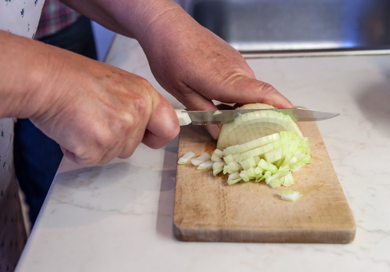 Brambory po uvaření necháme vychladnout a následně oloupeme, nakrájíme na malé kostičky (jako na bramborový salát) a přidáme k orestované cibuli.