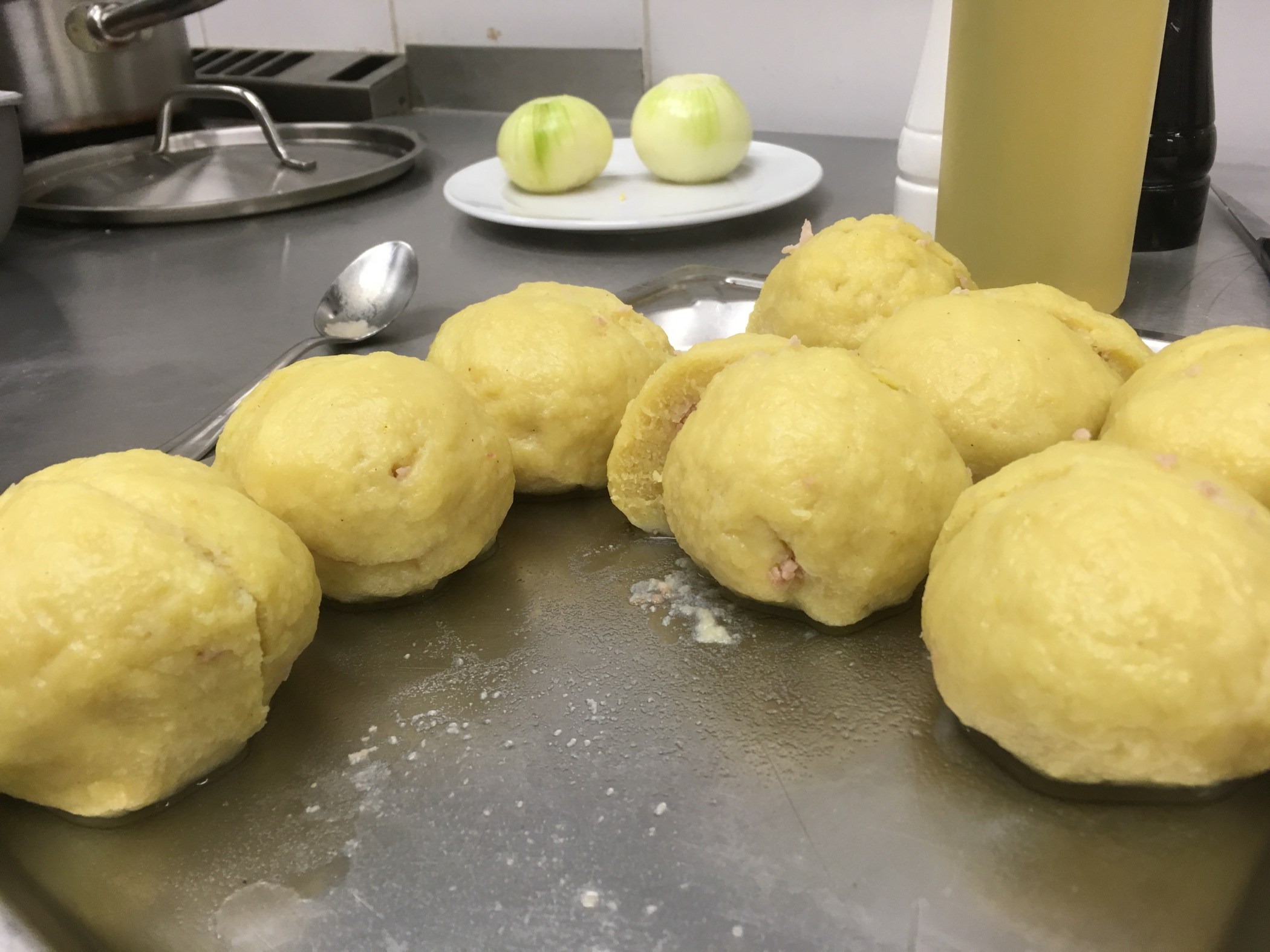 4. Kulaté knedlíky zaváříme do vroucí osolené vody a vaříme cca 15 minut. Raději jeden rozkrojíme, zda už je těsto uvařené.