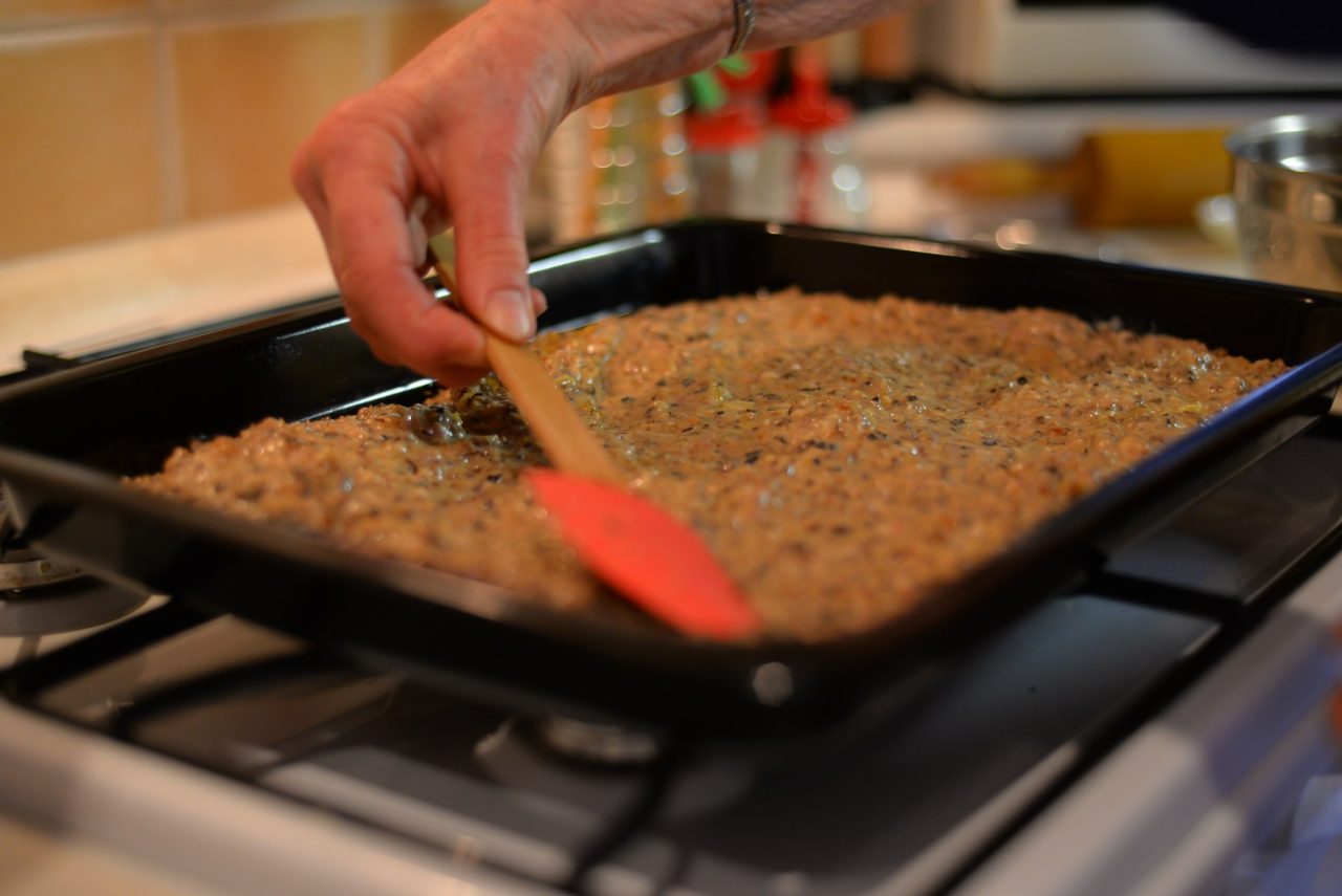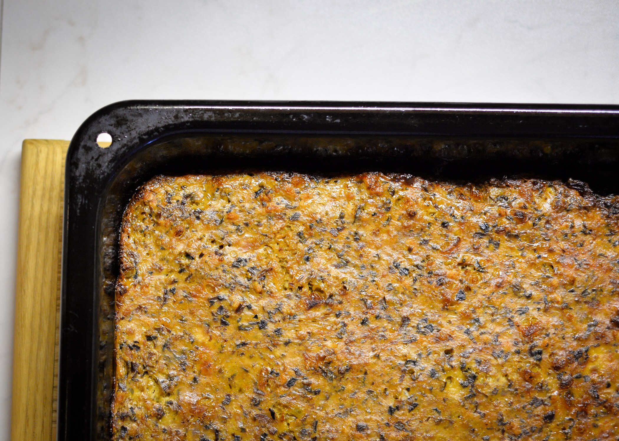 Před pečením necháme v troubě v prázdném pekáči rozpálit na dně 4 lžíce oleje. Když je rozpálený, nalijeme na něj houbovou směs, uhladíme a pečeme v rozehřáté troubě nejprve na 160 stupňů po dobu 45 minut. Poté teplotu zvýšíme na 200 stupňů a dopečeme dalších cca 20 minut.
