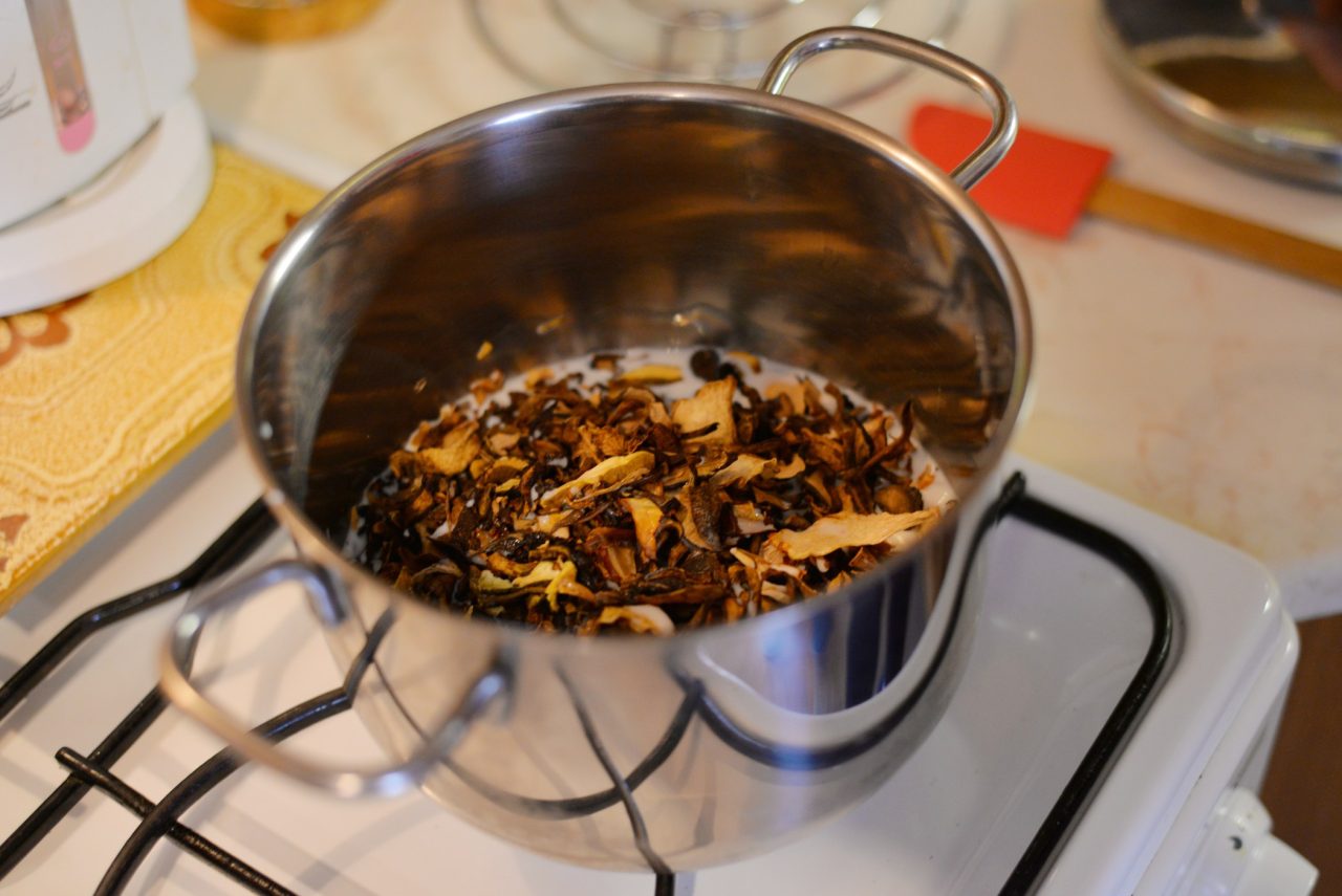 Do kastrolu nalijeme půl litru mléka, přidáme sušené houby a necháme 5 minut povařit. Pak odstavíme a necháme trochu zchladnout.