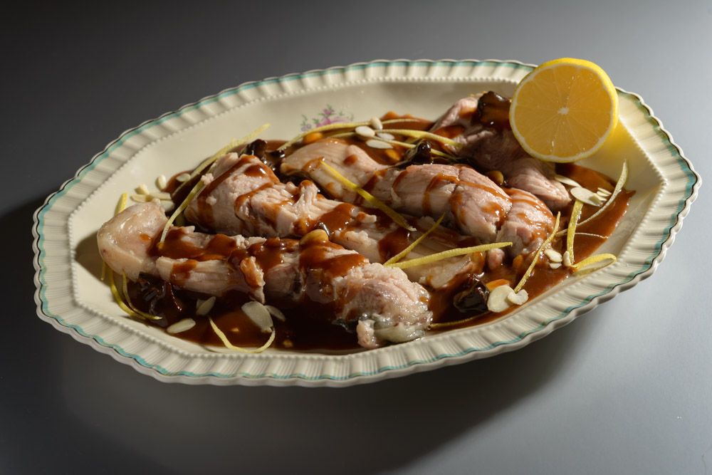 Na závěr do omáčky vložíme namočené rozinky a sušené švestky, nakrájené na plátky a spařené, oloupané, na nudličky nakrájené mandle.