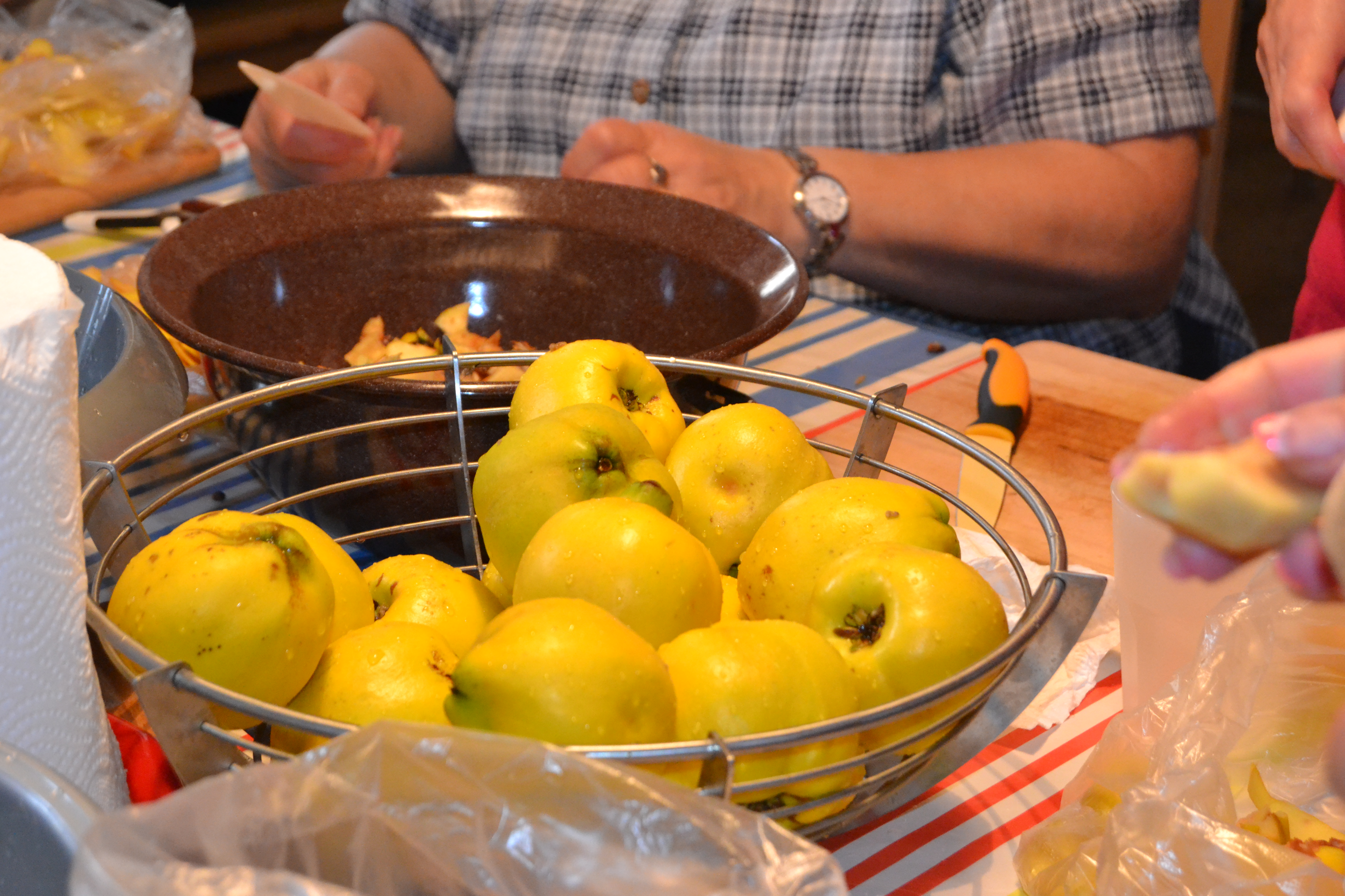 „My tady kdoule loupeme a zbavujeme je jadřinců,“ říkají ženy shromážděné v mlýnské kuchyni. Nakrájené kousky kdoulí končí v citronové vodě, aby nezhnědly. „Kdoule je středověké ovoce, které se u nás kdysi hodně pěstovalo. Je to vlastně hruškojablko, ale zasyrova je nepoživatelné. Kdoulke nejsou chutné a mohou způsobit i trávicí potíže,“ vysvětluje paní Vernerová.