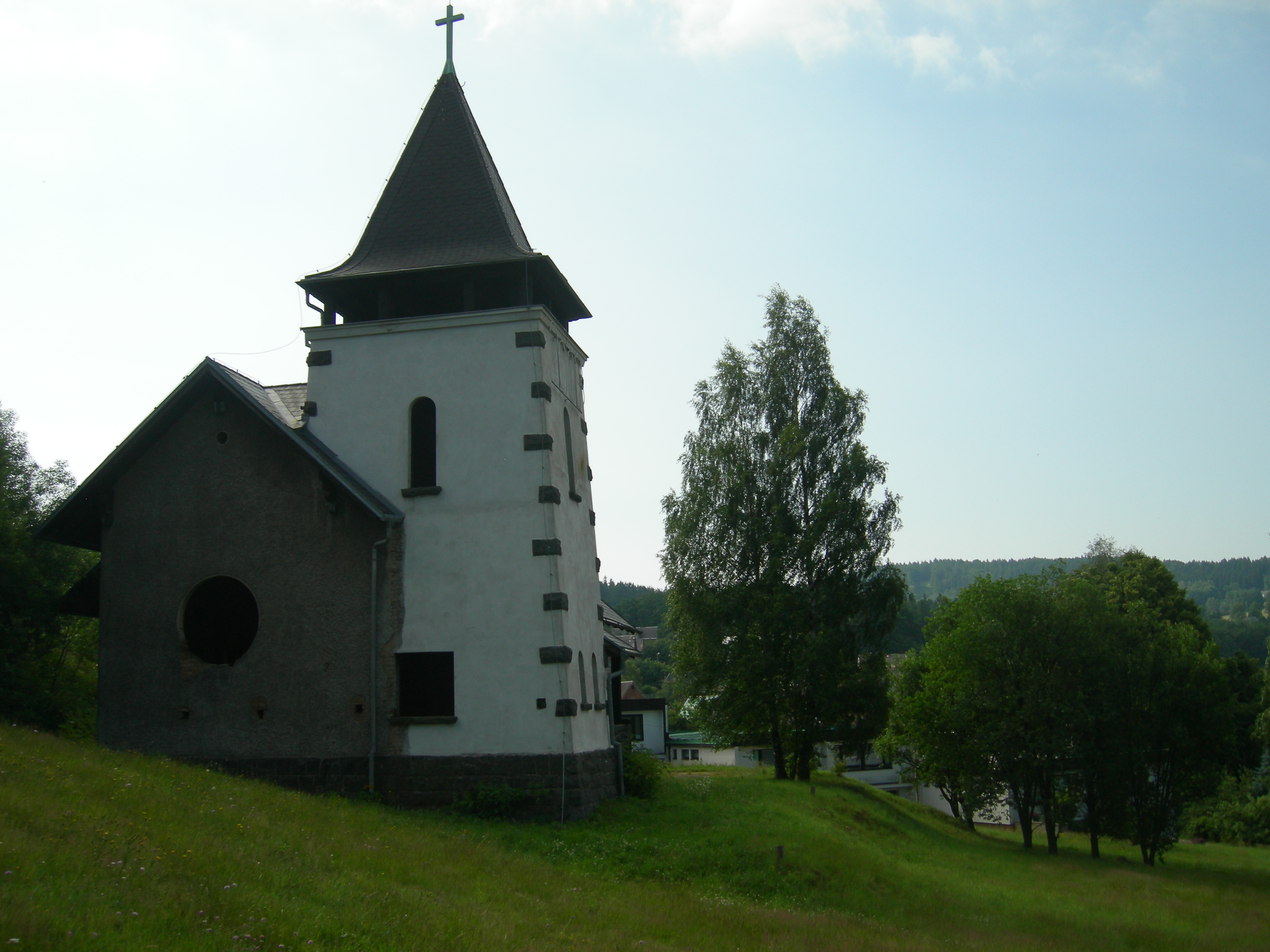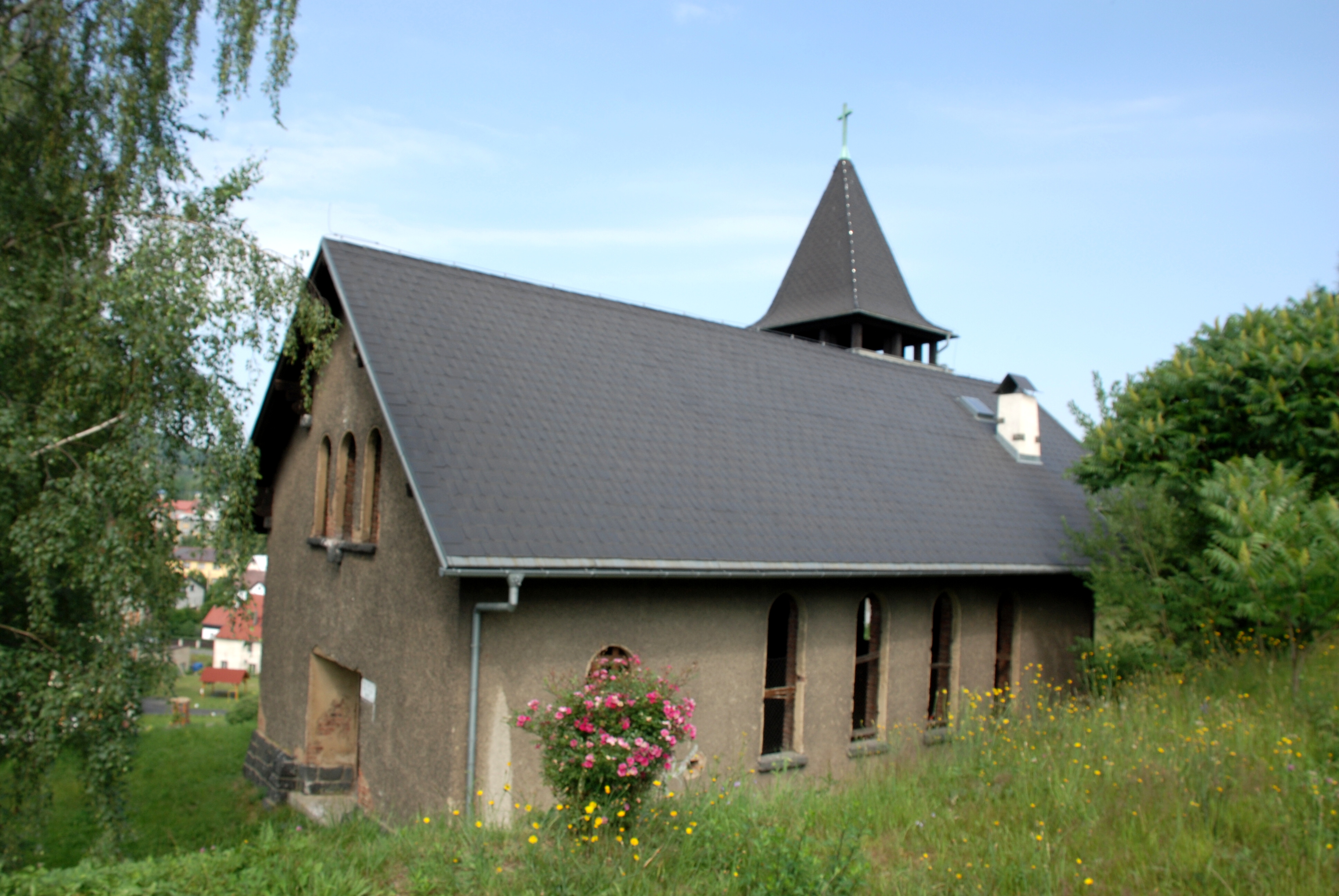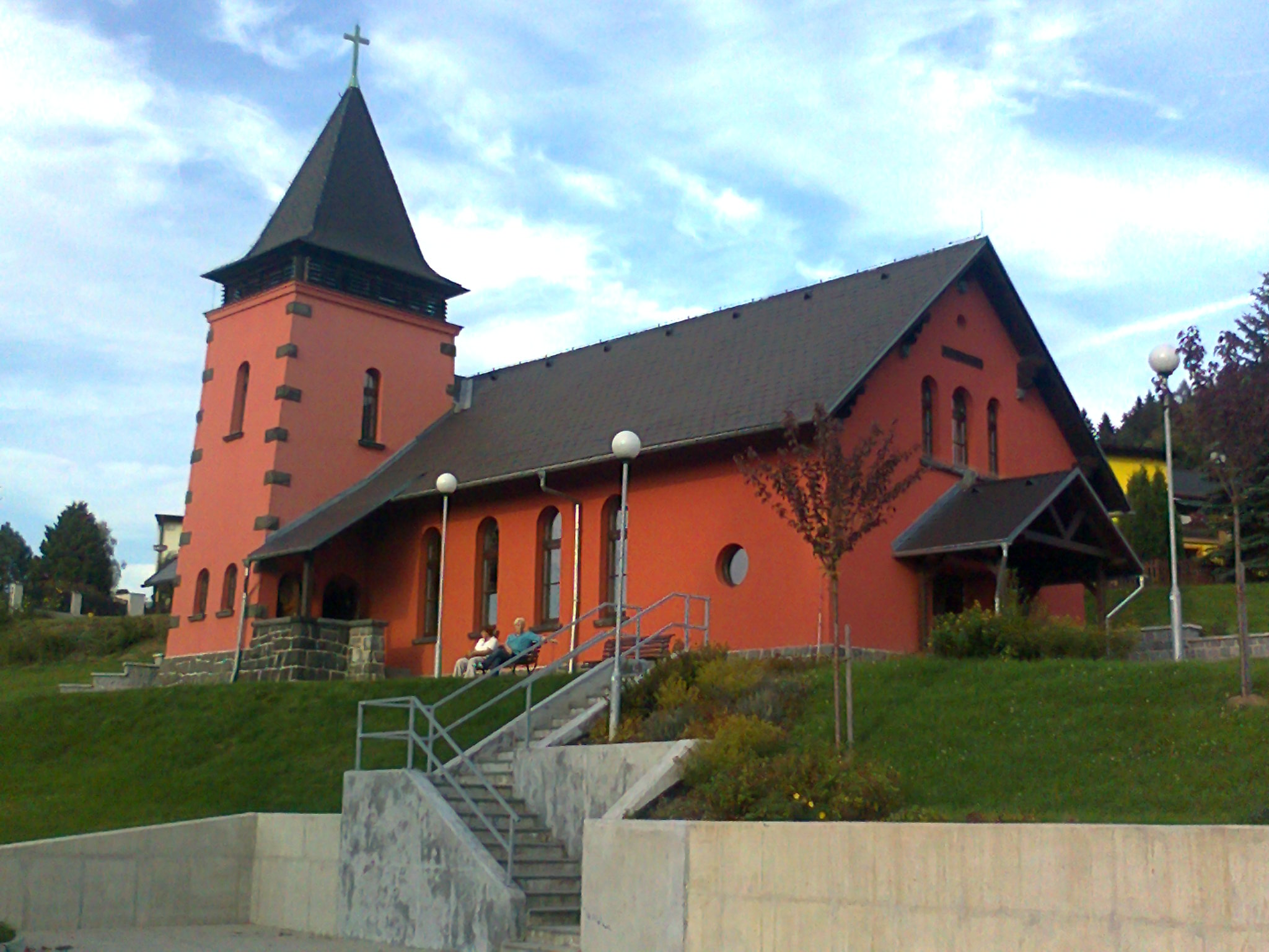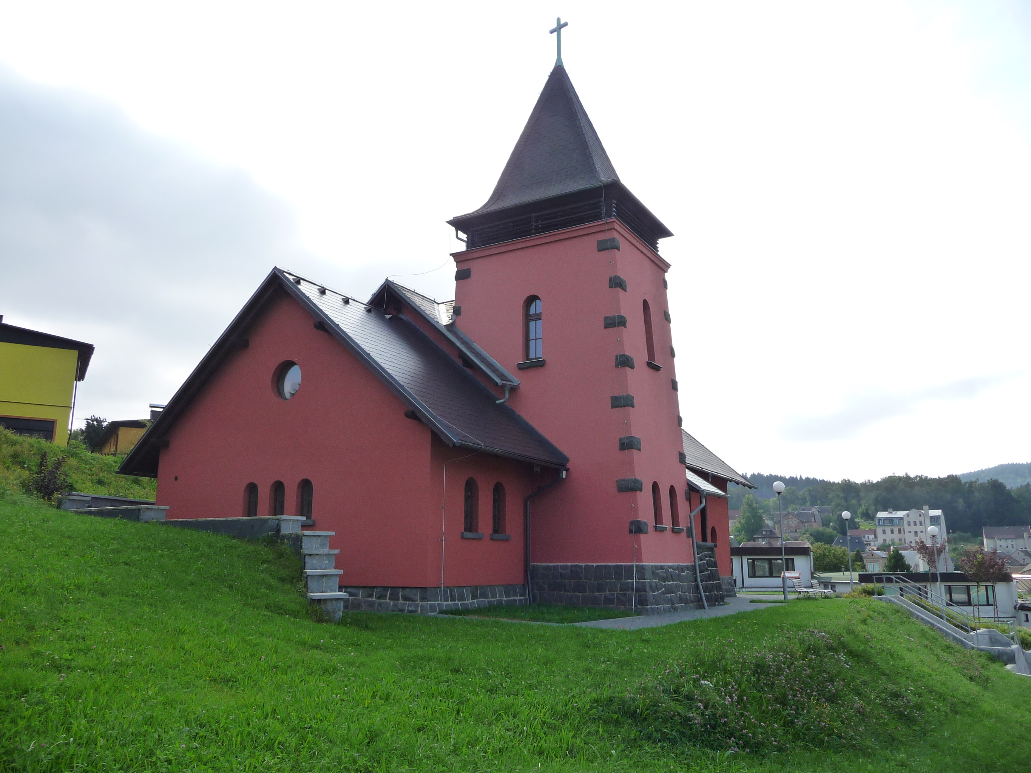 Centrum setkávání v Dolní Poustevně na Děčínsku určitě nepřehlédnete. Je to červený kostelíček na kopci a je vidět snad ze všech stran.