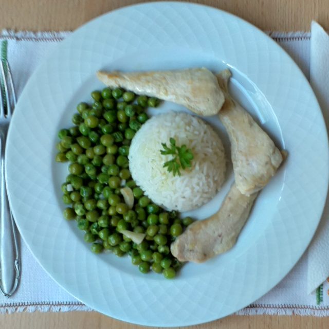 - Stehna opláchneme, osušíme, osolíme, mírně opepříme a dáme do pekáče s máslem, přidáme všechno koření, nakrájenou cibuli a na větší kousky nakrájenou zeleninu.