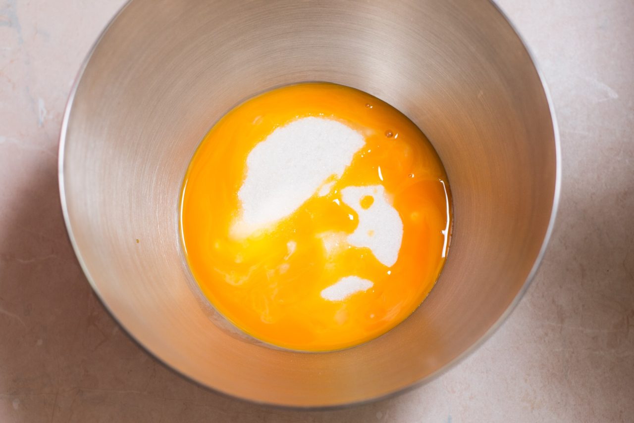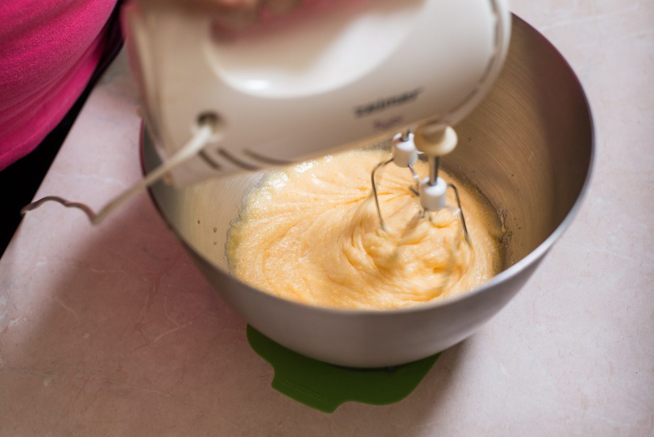 Nejdříve si připravíme těsto na piškot. V míse ušleháme pomocí ručního šlehače žloutky s cukrem do světlé pěny. Pak přilijeme vodu a olej a znovu prošleháme, až se ingredience spojí. Poté zašleháme po částech mouku smíchanou s kypřicím práškem. Nakonec do těsta zlehka vmícháme sníh ušlehaný z bílků.