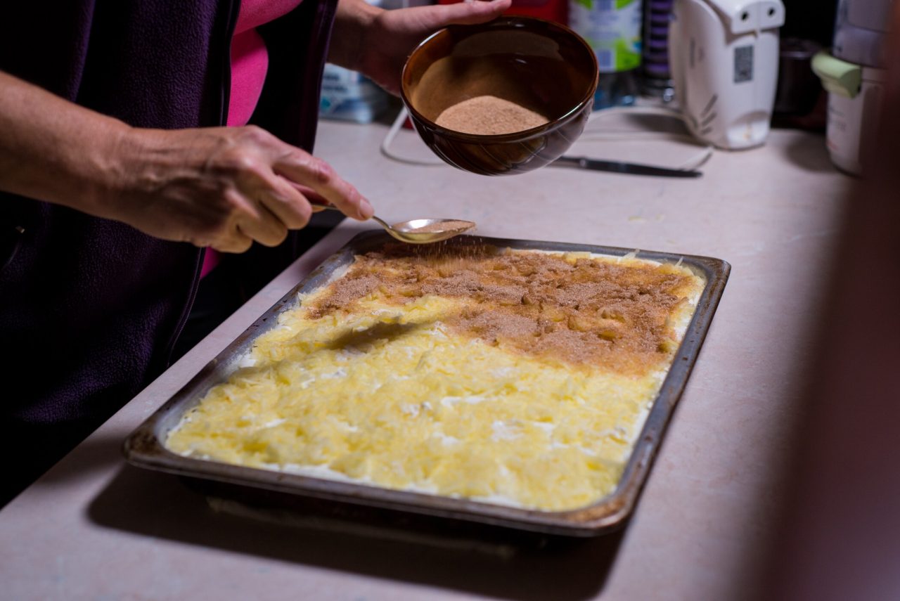 Po upečení a zchladnutí korpusu pak vrstvíme budoucí řezy. Korpus necháme na plechu a potřeme ho tvarohovou náplní. Na ni pak dáme po lžících tenkou vrstvu strouhaných jablek. Ta zasypeme 100 g cukru smíchanými se lžící mleté skořice.