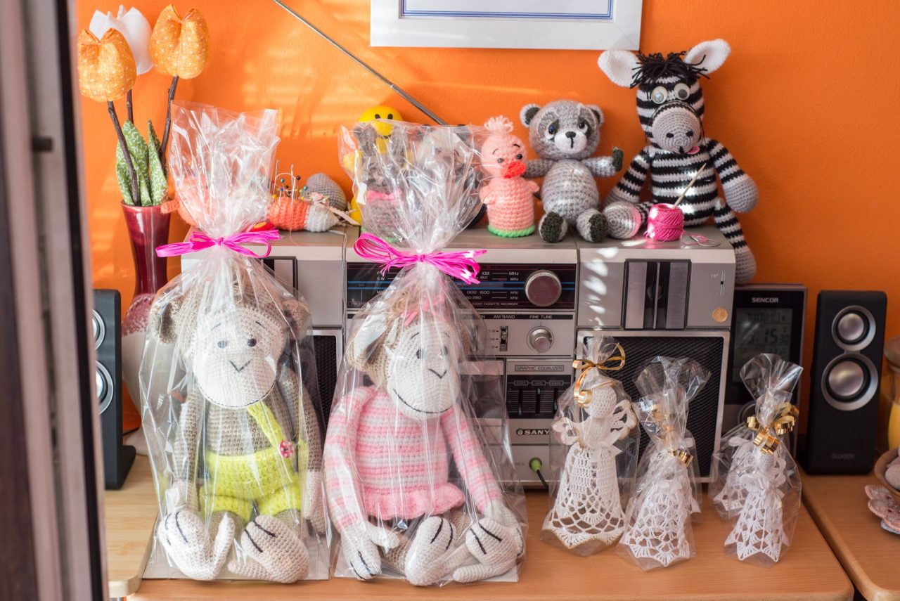 Vyhlížela nás z terasy svého domu, ale špatným směrem. Překvapili jsme ji a zaskočili z druhé strany. Předali jsme dárek a hned potom nás vzala dovnitř, kde nám ukázala, čím se baví ve volném čase. Háčkuje a dokáže udělat i háčkované zvonky, anděly, čepice i opičáky. I my dostali malý dárek.