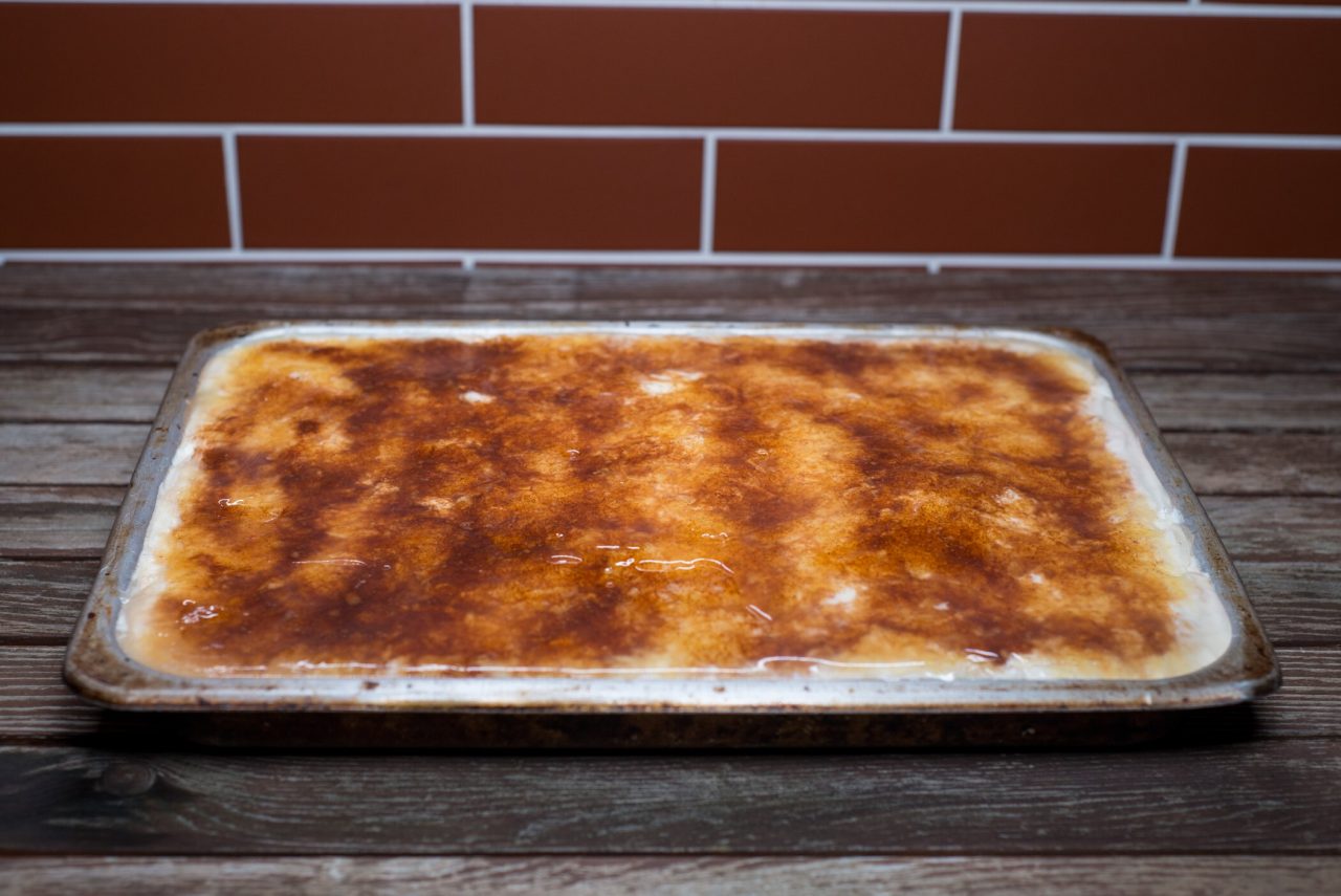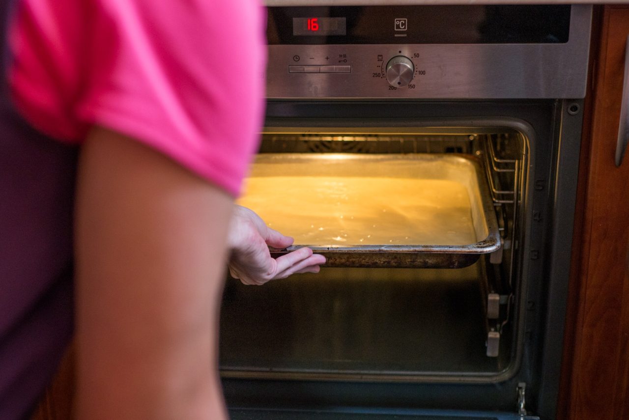 Těsto nalijeme na plech vymazaný máslem a vysypaný moukou, uhladíme a pečeme při 180 °C asi 25 minut do světle hnědé barvy.