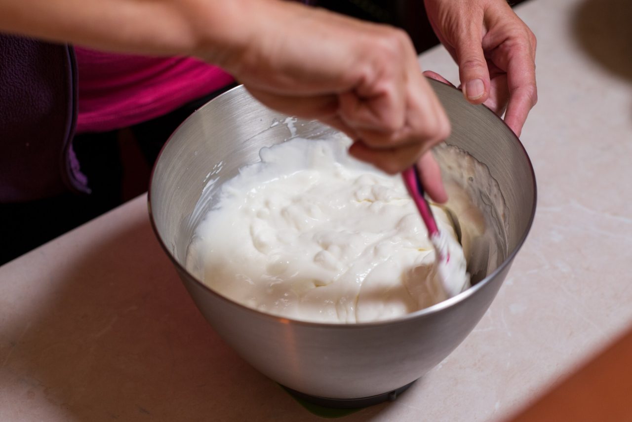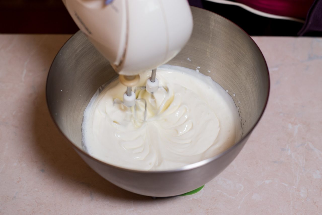 Mezitím si připravíme tvarohovou náplň. V míse rozšleháme pomocí ručního šlehače tvaroh, bílý jogurt, cukr a vanilkový cukr. Poté do směsi přimícháme smetanu ušlehanou se ztužovačem šlehačky. Musí vzniknout hladká krémová náplň.