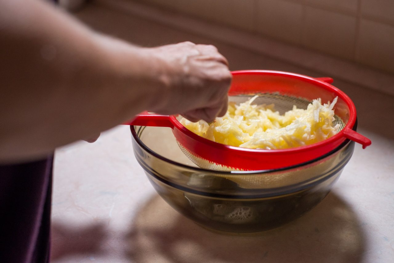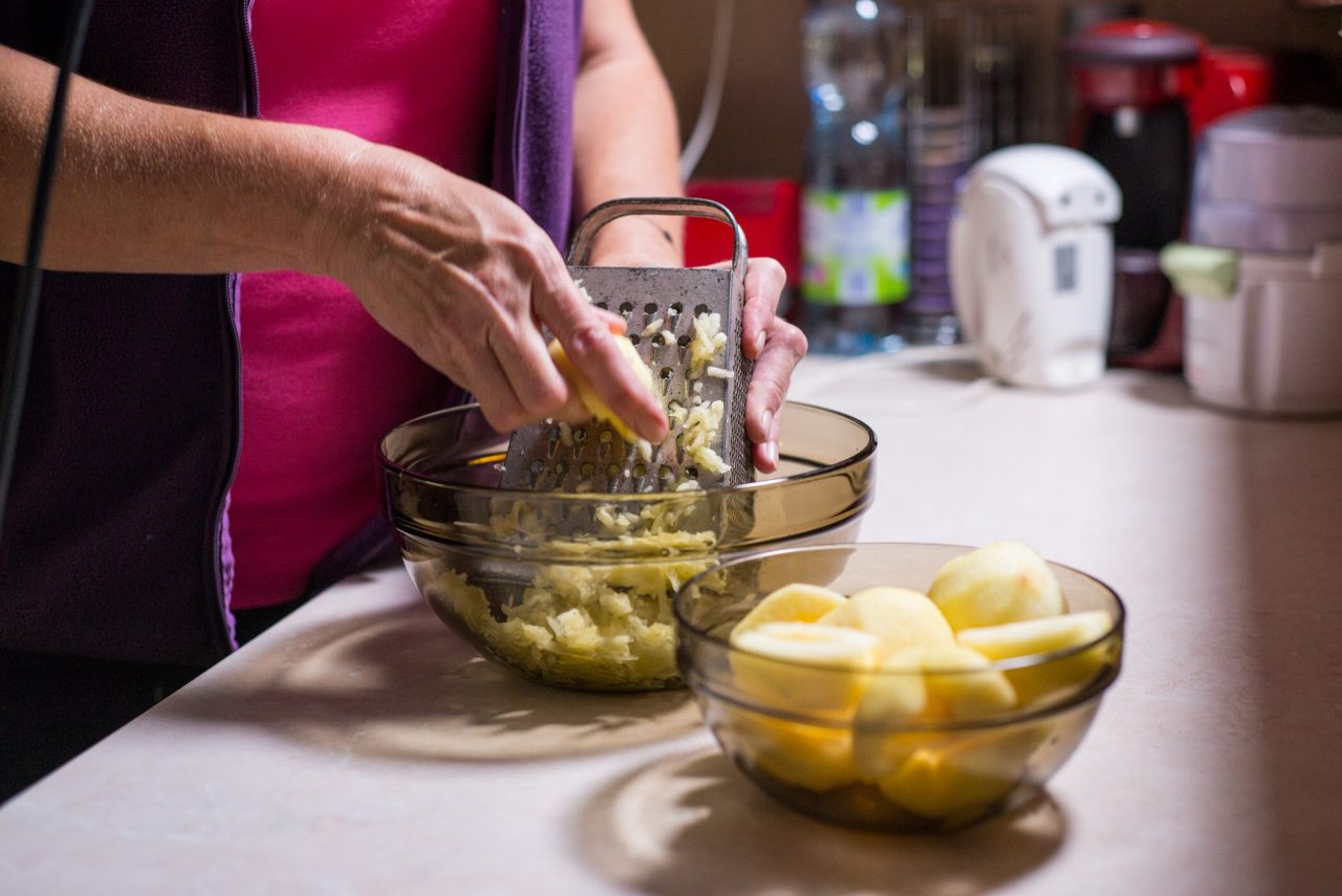Dále oloupeme jablka, zbavíme jádřinců a nastrouháme je na hrubém struhadle. Z nastrouhaných jablek vymačkáme přebytečnou šťávu. Po nastrouhání musíme získat 550 g jablek.