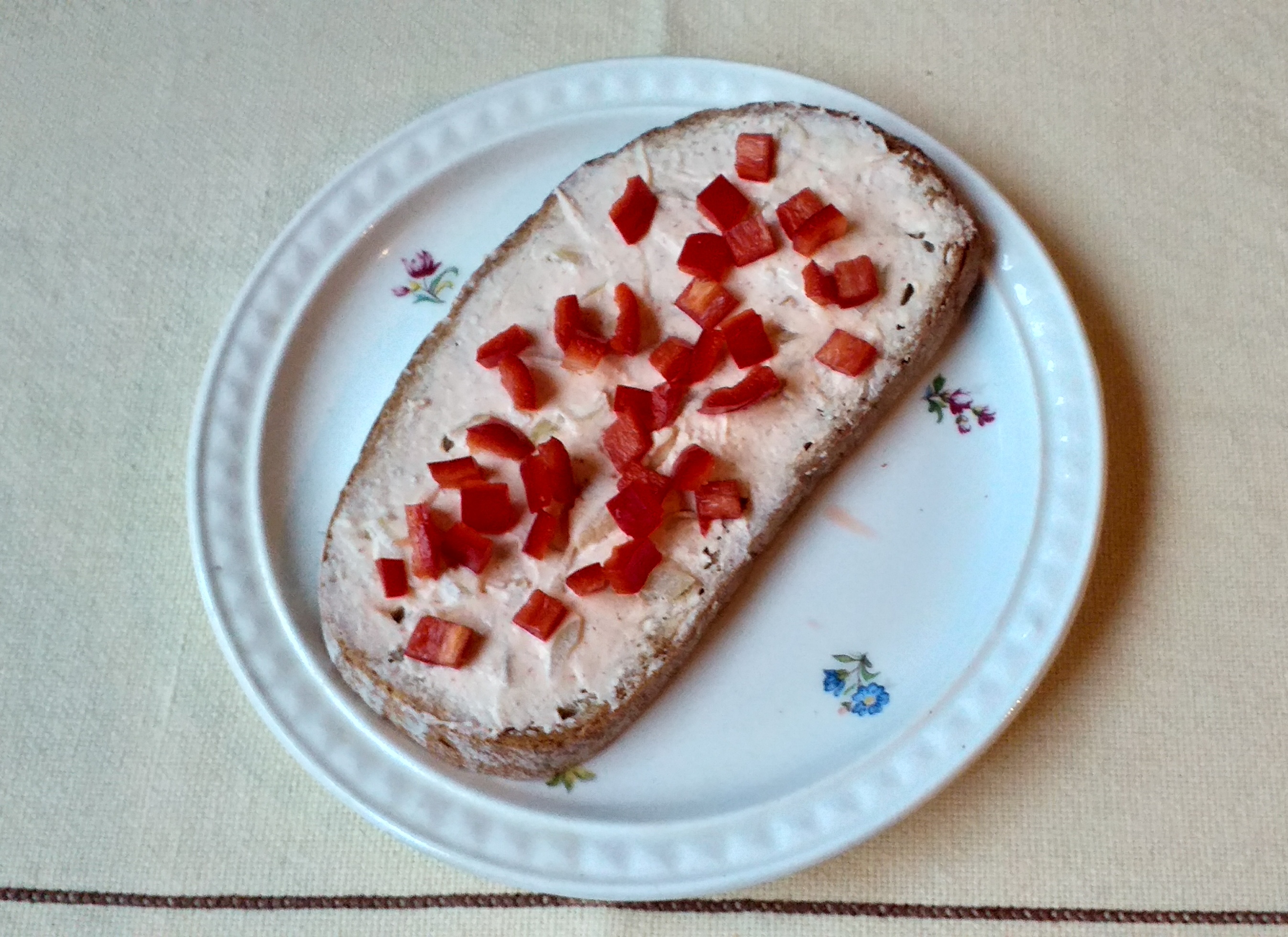 - Mažeme na krajíčky chleba a zdobíme nakrájenou červenou paprikou.