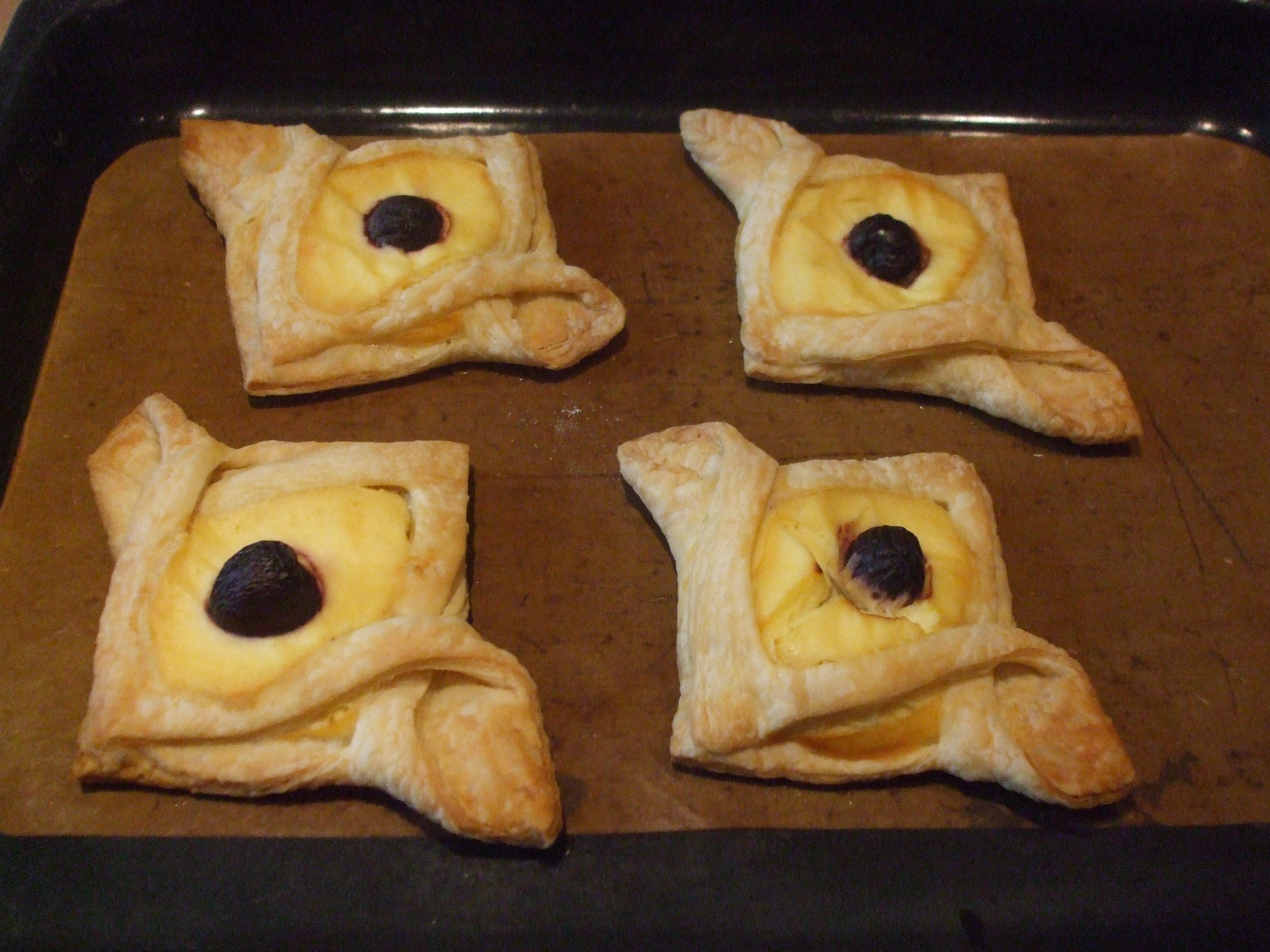 3. Doprostřed čtverců dáme tvarohovou nádivku, položíme jahodu nebo višni a nakrojené rohy přetáhneme proti sobě a přitiskneme v protilehlém rohu – opět fotografie napoví.
