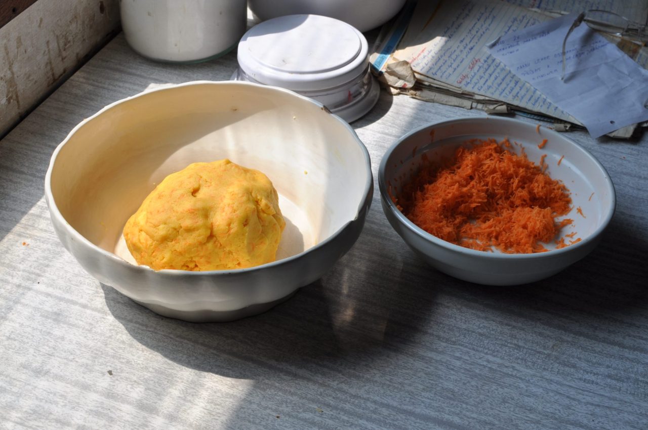 Mrkev omyjeme, očistíme a na jemném struhadle nastrouháme. Přendáme do mísy spolu s polohrubou moukou, rozměklým máslem, práškem do pečiva a žloutky. Vypracujeme těsto, které necháme chvíli odpočinout.