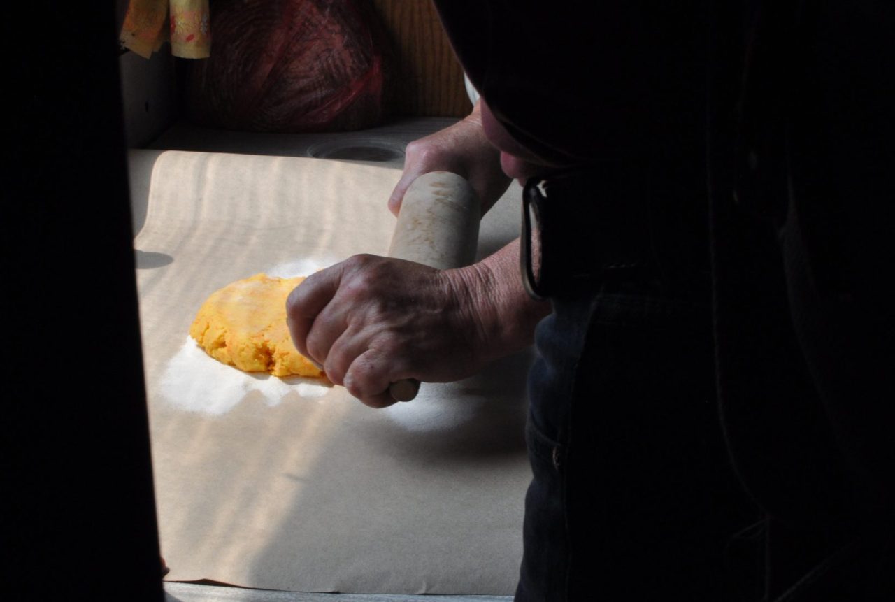 Těsto vyválíme na 0,5 cm vysokou placku, z které vykrajujeme čtverečky (asi 10 x 10 cm).