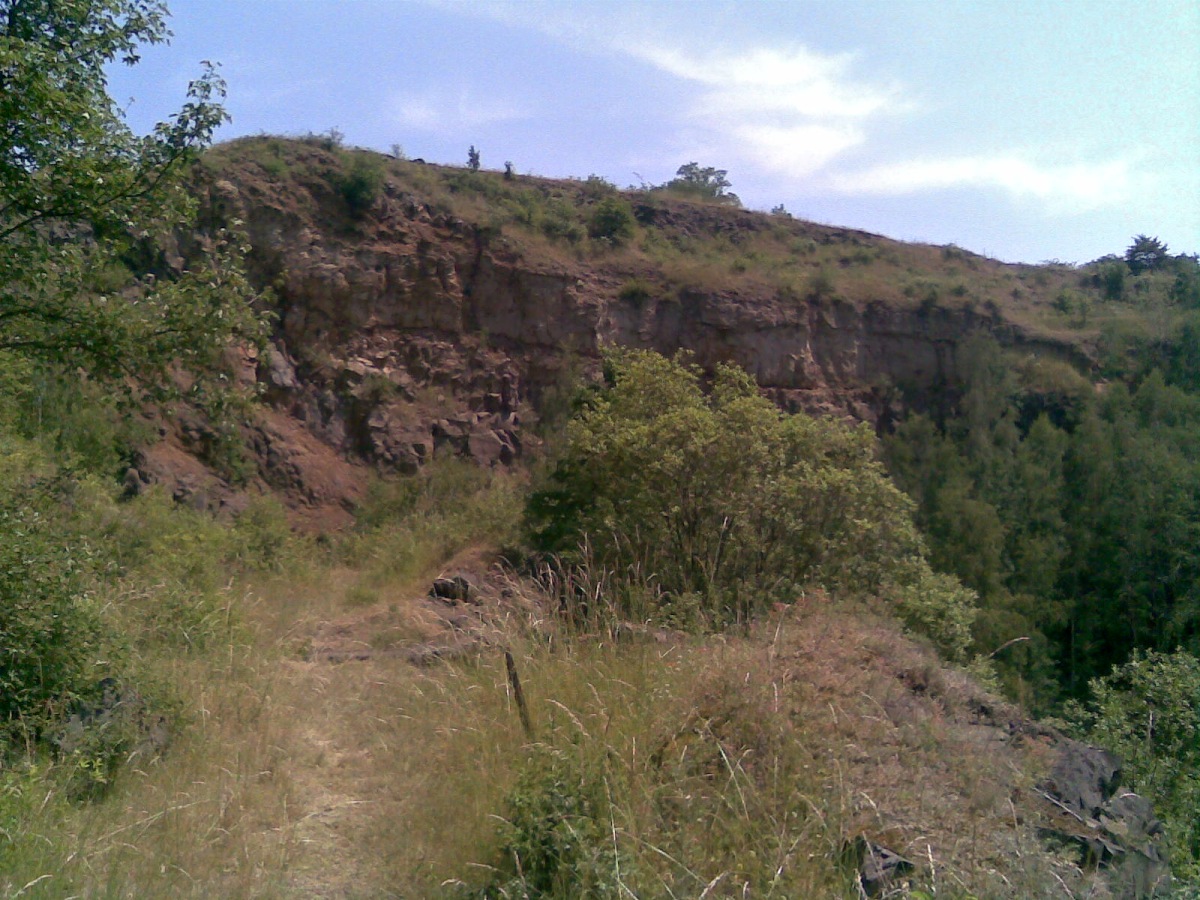 Naučná stezka vás po západojižním svahu přivede přímo na dno lomu, kde je vidět celý bývalý kráter sopky. Během sopečné aktivity tu totiž vznikla puklina hluboká asi 700 metrů, která se postupem doby vyplňovala povrchovými horninami. Dnes vás v těchto místech čeká stěna bývalého lomu vysoká přibližně 30 metrů, kde jsou jasně viditelné geologické vrstvy.
