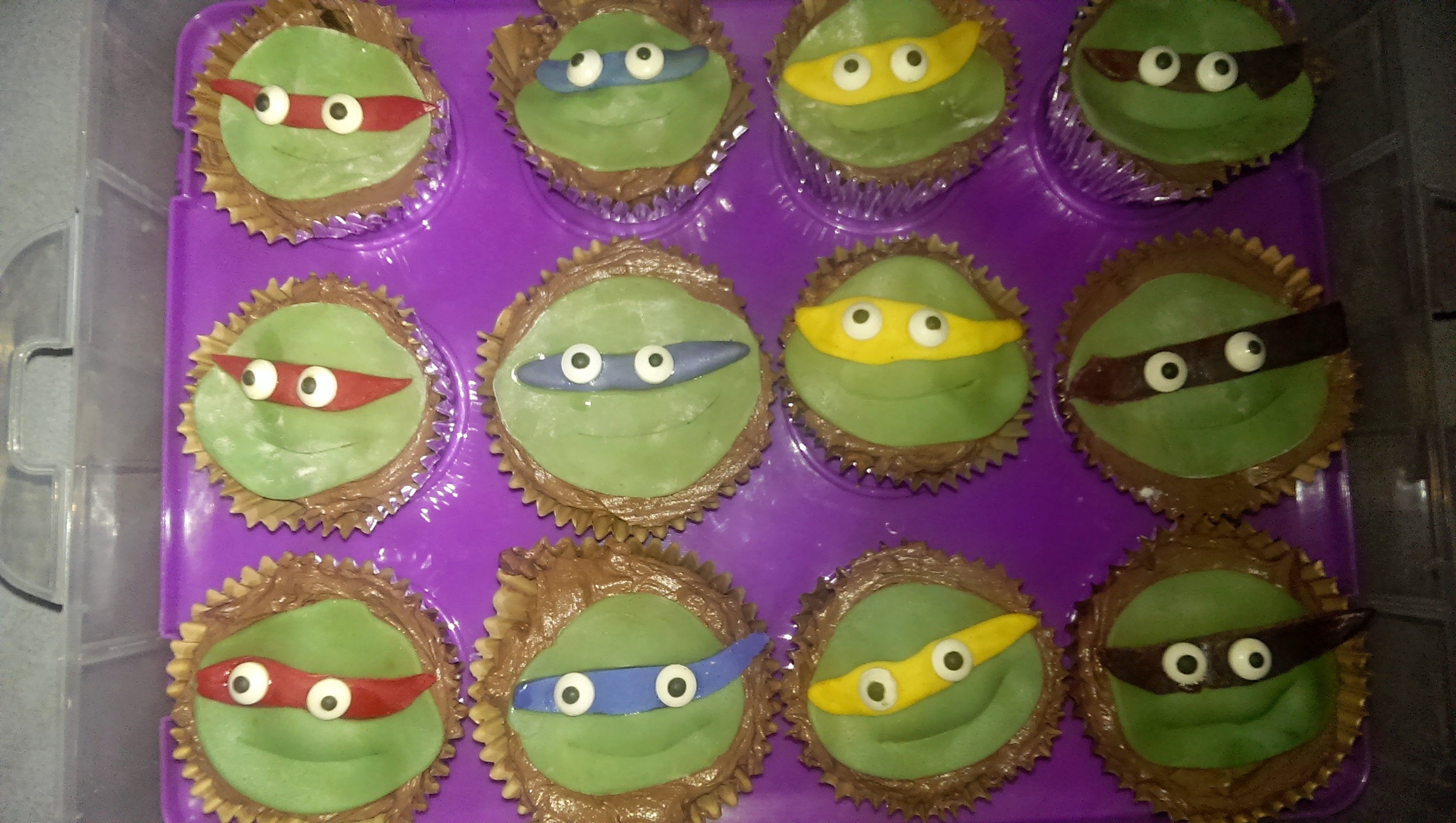 4. Ze zeleně zbarveného marcipánu vyválíme plát, vykrájíme kolečka o stejném průměru jako mají muffiny. Z dalších barev vykrájíme proužky, které poslouží jako masky ninja želviček a nakonec vytvoříme z kuliček bílého marcipánu oči. Ty dotvoříme ještě malinkou tečkou třeba z čokolády nebo také z marcipánu.