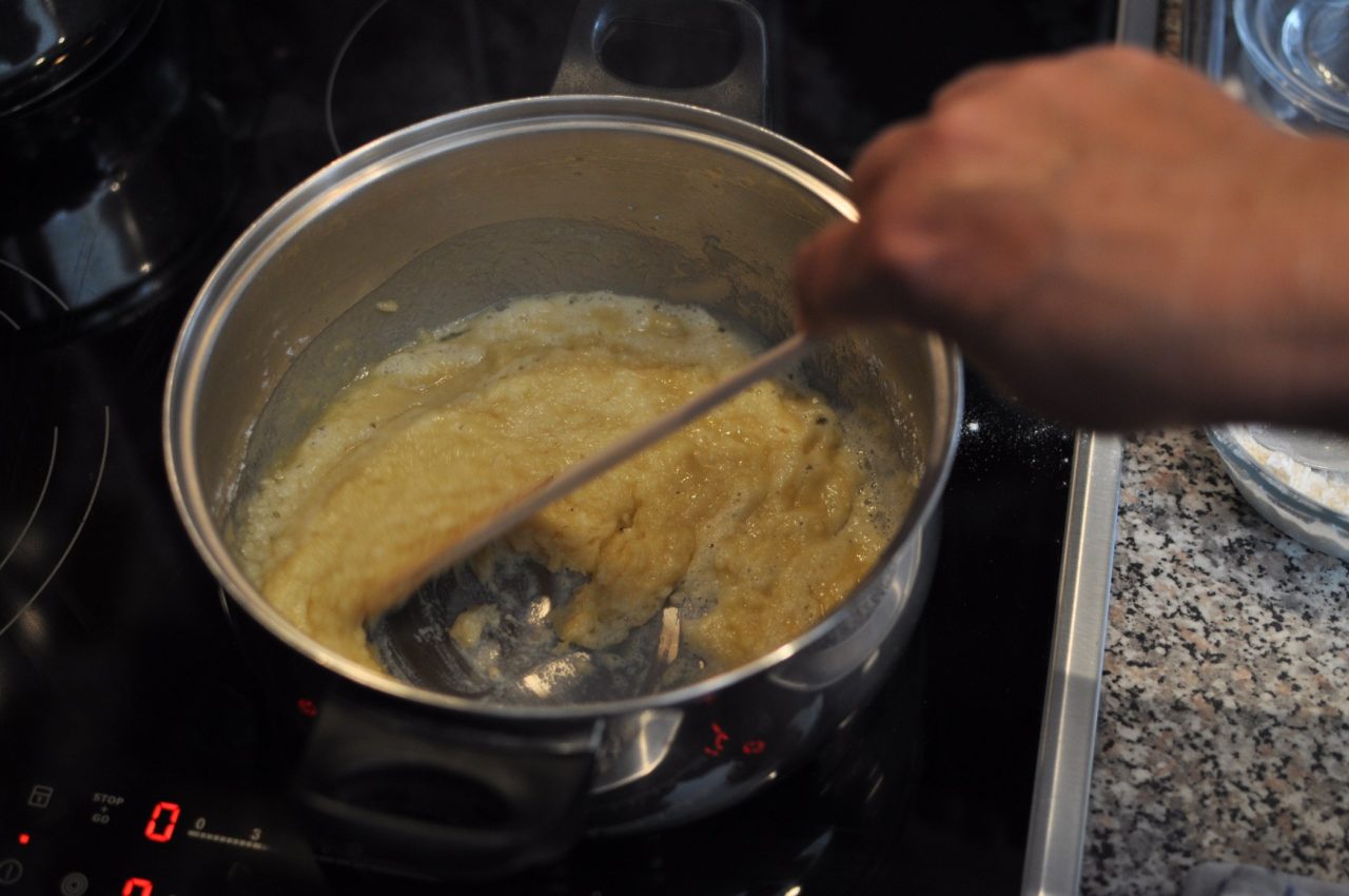V kastrolu si rozpustíme máslo a za stálého míchání do něj vsypeme mouku. Rozmícháme do hladka. Jakmile jíška začne růžovět, přilijeme mléko zředěné vodou. A to v poměru 2/3 vody a 1/3 mléka.