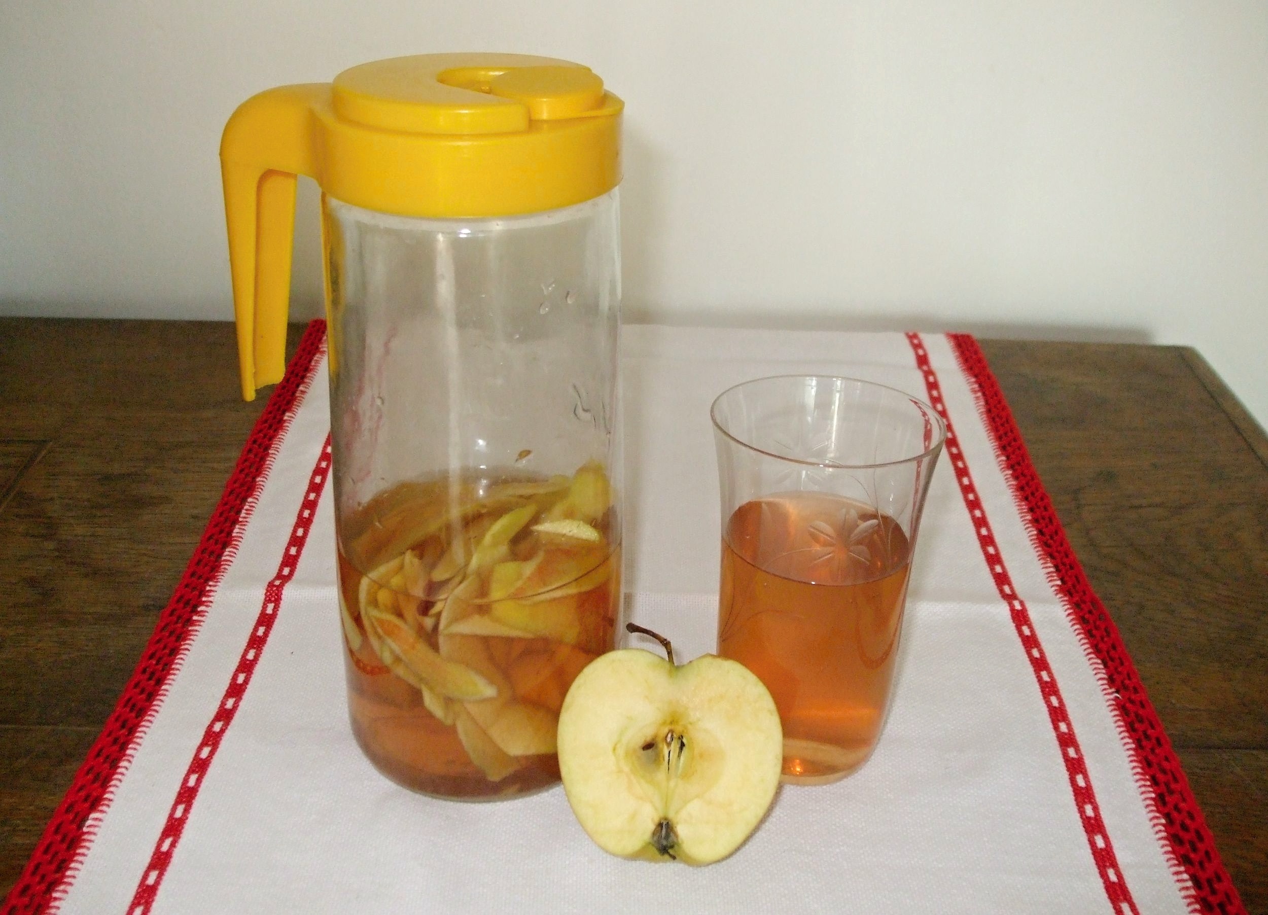 1. Jablečné slupky (z omytých jablek) krátce povaříme a odvar i se slupkami smícháme s předem připraveným ovocným čajem.