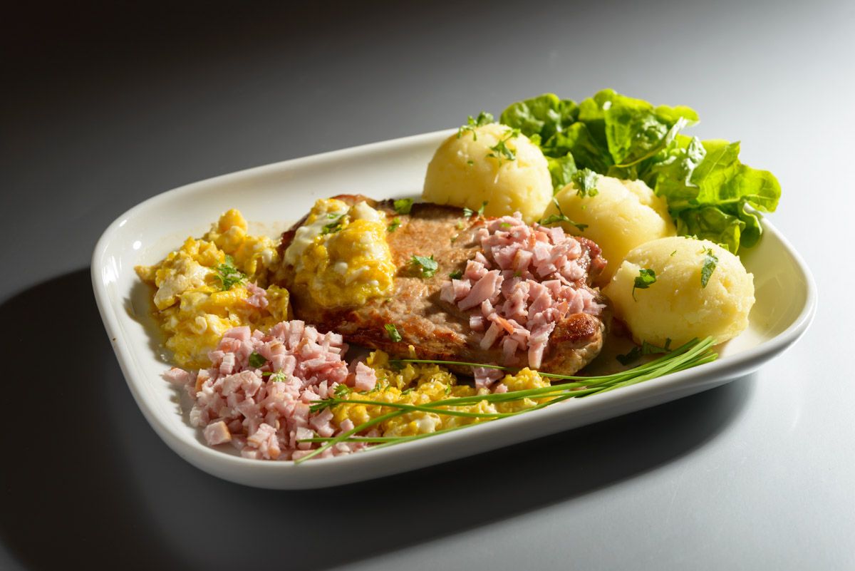 Na pánvi rozehřejeme olej a 1 lžíci másla. Maso jemně naklepeme, osolíme a pozvolna z obou stran plátky masa opečeme. Na zbytku másla připravíme řídká míchaná vejce, kterými obložíme opečené maso.