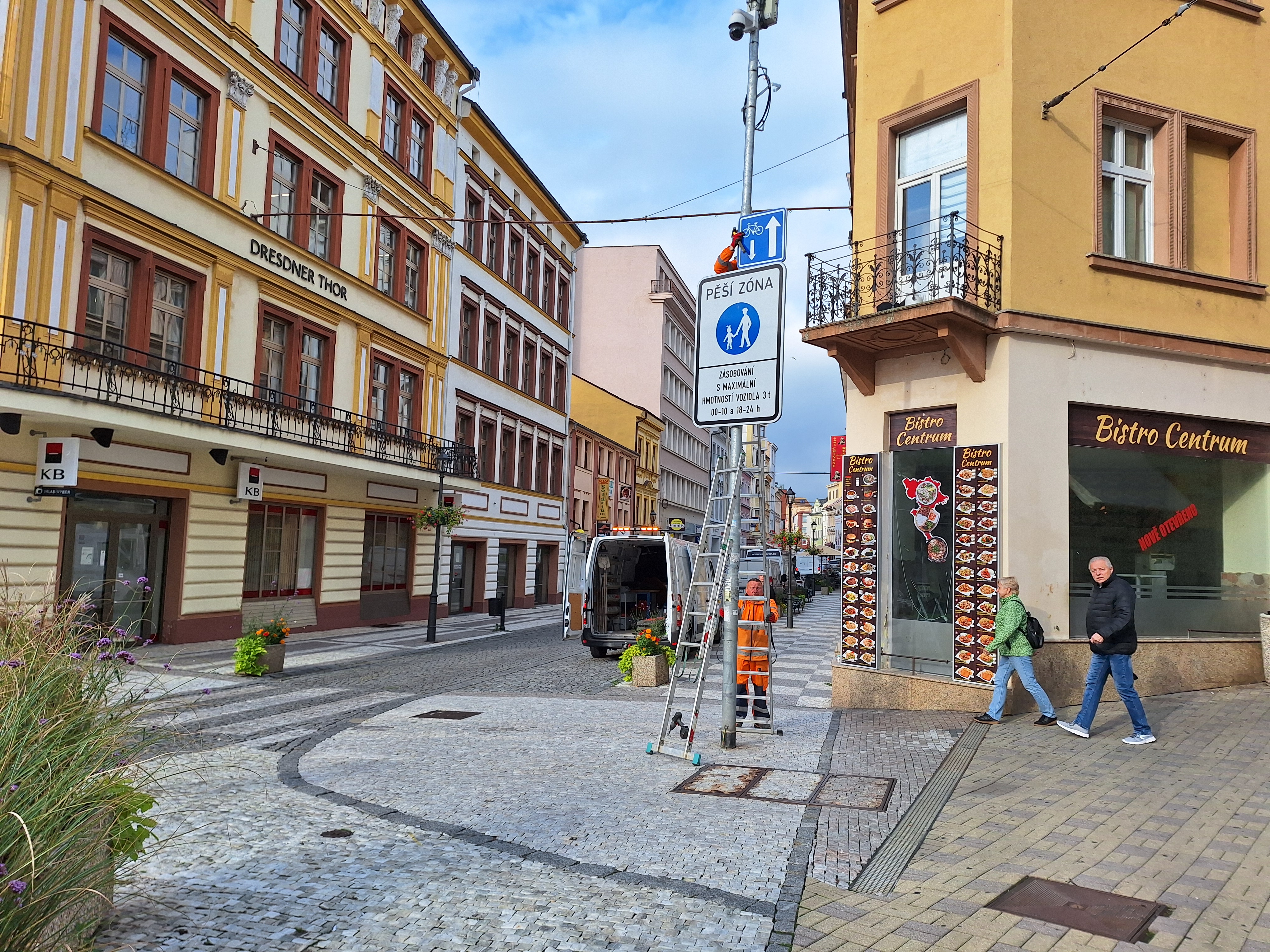 Teplice mění pěší zónu v centru města za oblast s 30kilometrovou rychlostí. Dělníci už vyvěšují dopravní značky a postaví také retardéry ve vybraných ulicích. Kompletní dopravní změny v centru Teplic začnou platit 9. října. Jedna novinka ale řidiče může překvapit už 2. října.