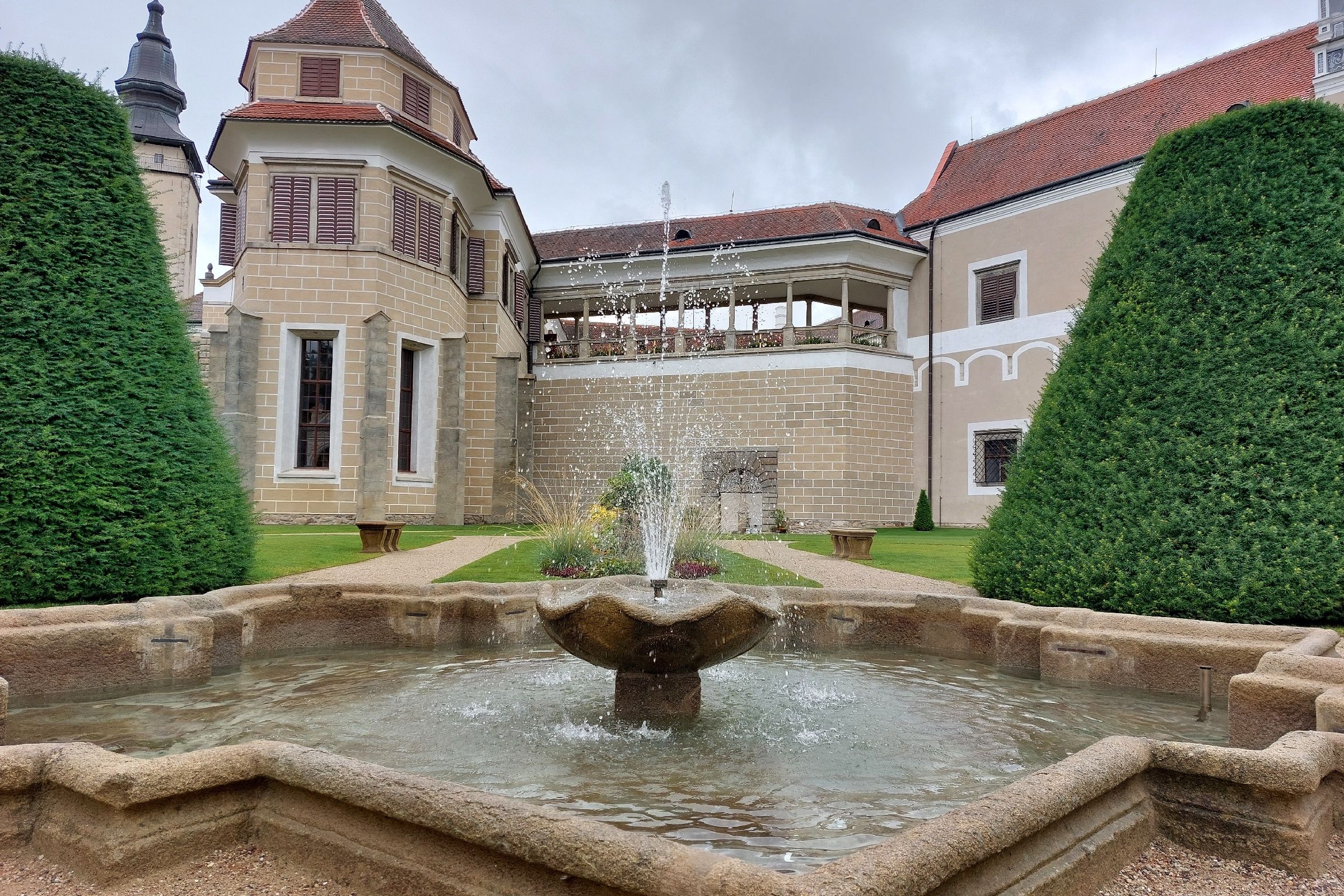 Jednotlivé části zámku propojují arkády, které nabízejí pohled jak na nádvoří, tak do zámecké zahrady. V jejím středu je jezírko s vodotryskem. Milovníci pohádek se zastavují u velkého reliéfu s antickou tematikou, u kterého se natáčela jedna ze scén slavné Pyšné princezny. „Ten sem nechal umístit Zachariáš z Hradce v době, kdy mu zemřela jeho milovaná manželka Kateřina z Valdštejna,“ vysvětluje Roman Dáňa.