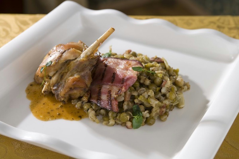 Upečené maso rozdělíme na porce, obložíme plátky pečené slaniny a podáváme přelité vypečenou šťávou s rozdušenou cibulí a česnekem. Použitím červeného vína a rozmarýnu králík svou chutí připomíná zvěřinu.
