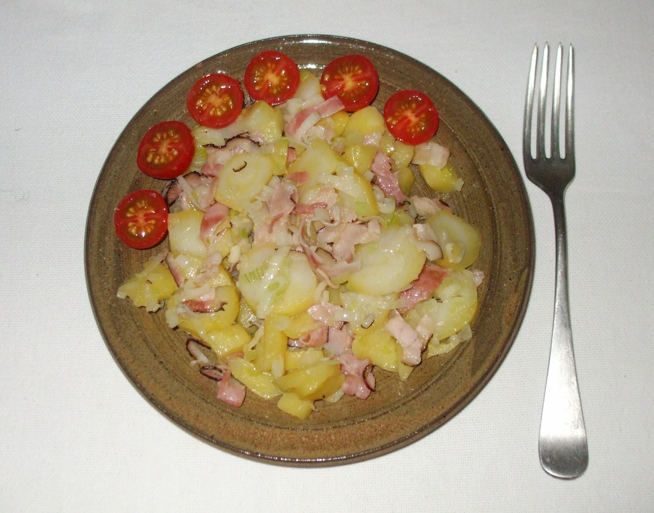 4. Na tento základ dáme nakrájené vařené brambory, v chlapštější verzi je možné okořenit mletou paprikou nebo pepřem, lehce promícháme a opečeme.
