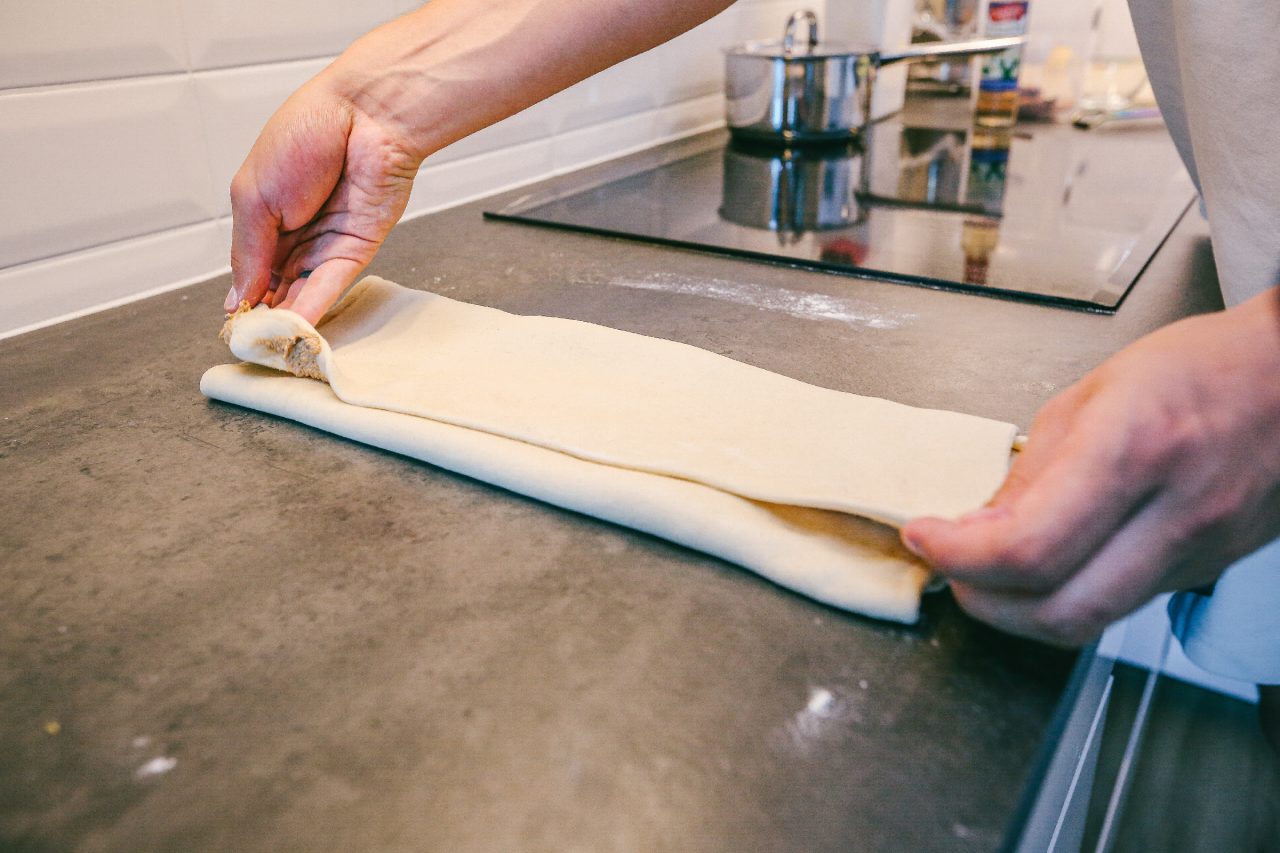 Necháme těsto odpočívat ještě pět minut, tím pádem nebude mít tendenci se stahovat zpátky. Potom placku potřeme pistáciovo-skořicovou pastou a těsto přeložíme na třetiny, jako bychom skládali list papíru do dlouhé dopisní obálky.