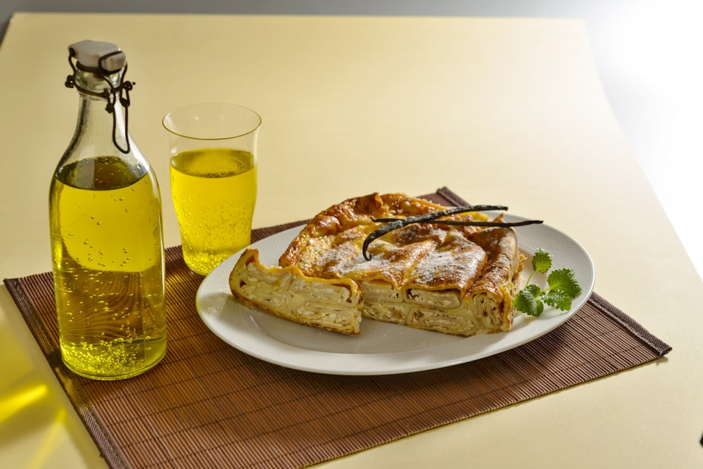 Potřené palačinky stočíme, překrojíme na půl a naskládáme je do máslem vymazaného a strouhankou vysypaného pekáče nebo zapékací mísy. Krátce je zapečeme ve vyhřáté troubě, pak je zalijeme smetanou, do které jsme rozkvedlali vejce. Zapékáme do zlatavého zabarvení.