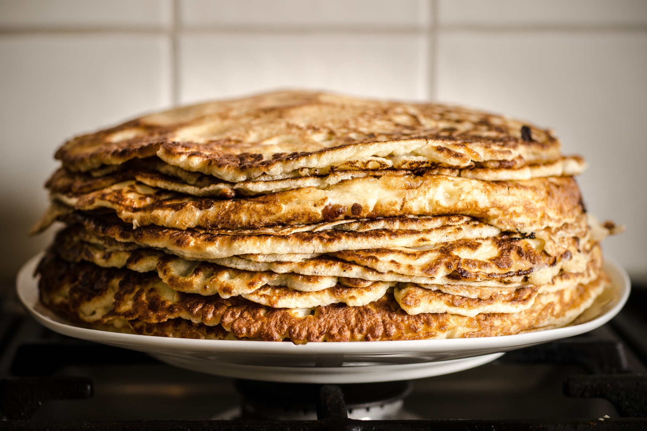 - Pak na pánvi potřené tukem pečeme palačinky a skládáme je na talíř.