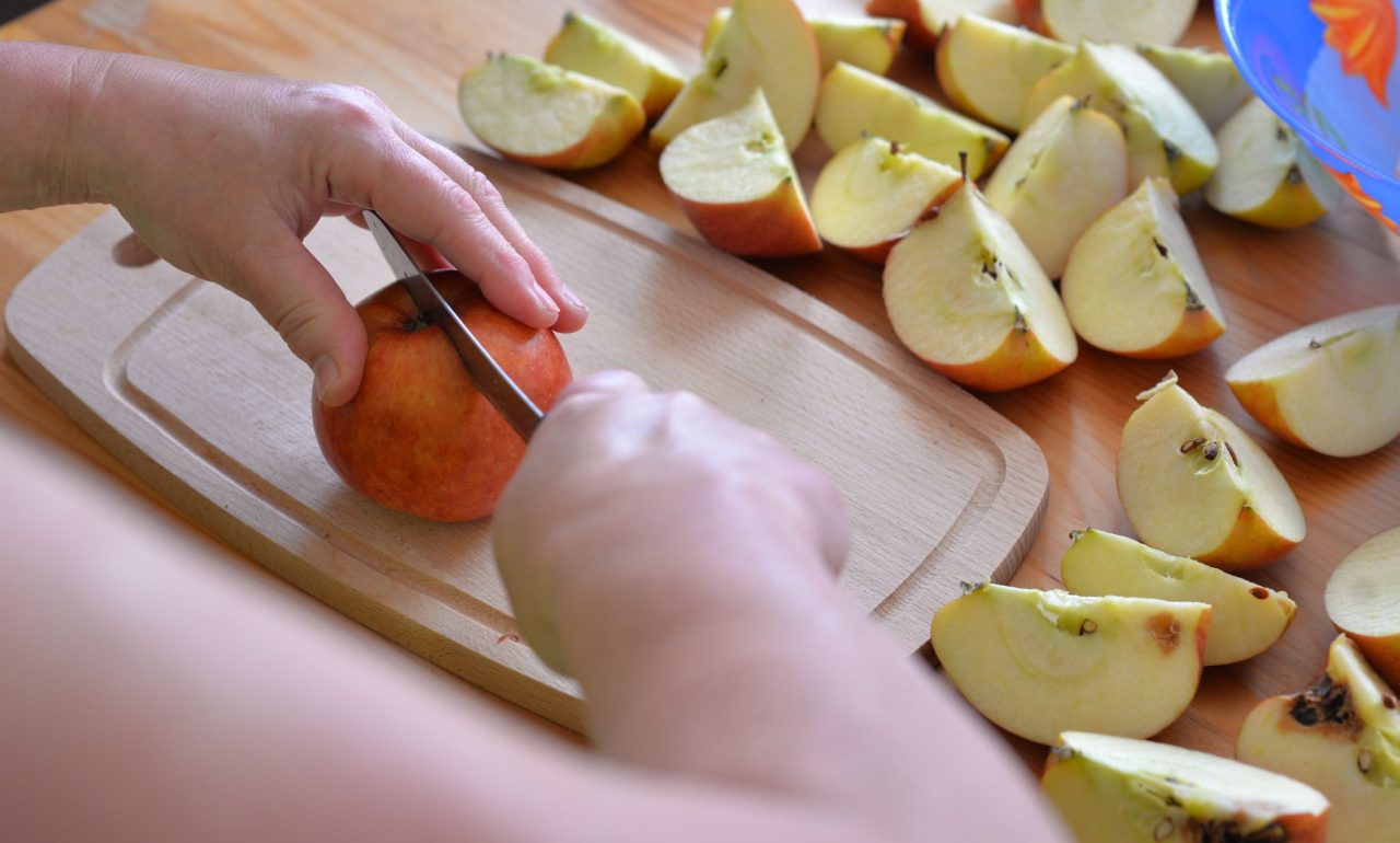 Jablka oloupeme a zbavíme jádřince. Rozkrojíme je na čtvrtky a následně ještě na půl. Takže z každého jablka bude osm knedlíků.