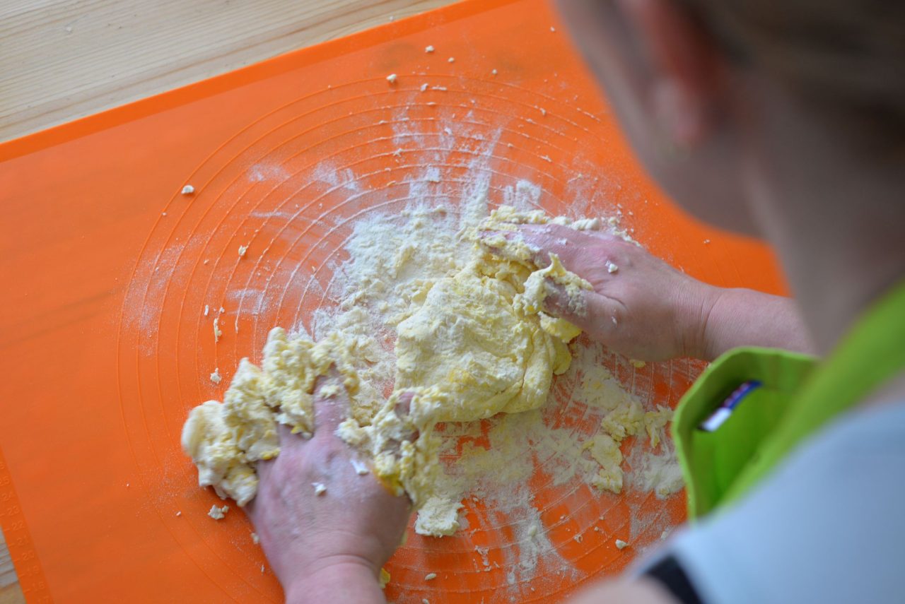 Do mísy dáme polohrubou mouku a jednu vaničku tvarohu. Promícháme. Přidáme vejce a opět promícháme. Připravíme si těsto, které má lepivou konzistenci.