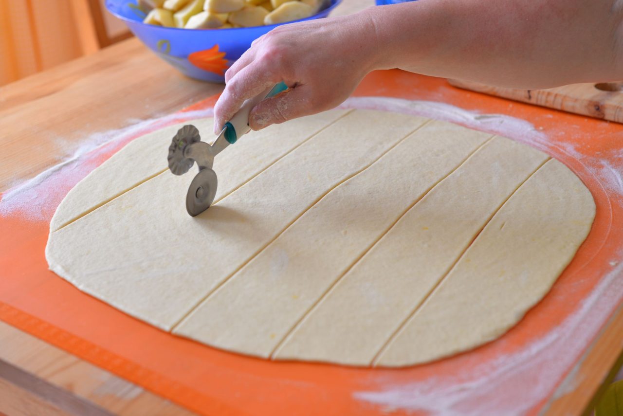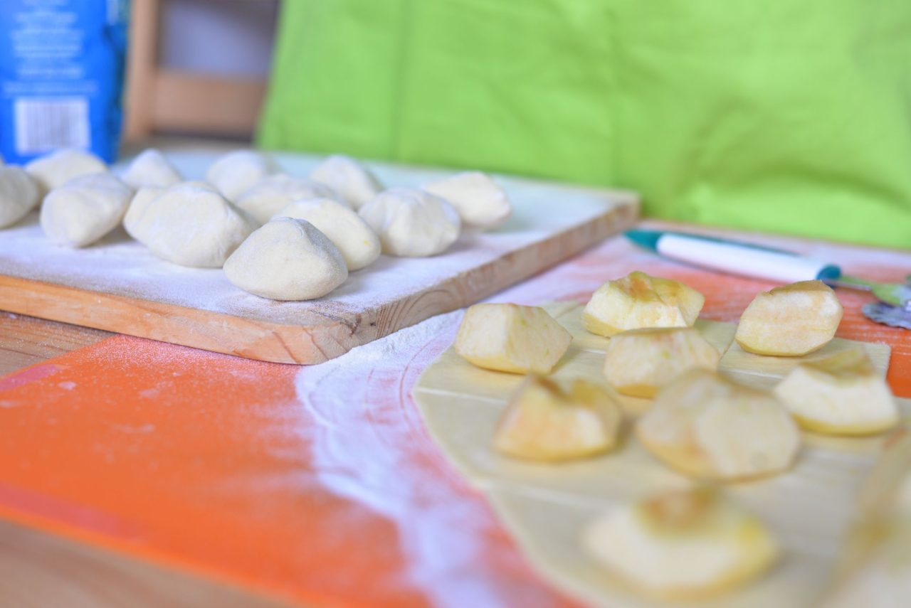 Z těsta vyválíme 2 – 3 mm tenkou placku. Rádýlkem placku rozdělíme na pruhy široké asi 10 cm, na které vyskládáme v pravidelných rozestupech osminky jablek a pak odkrajujeme čtverečky těsta i s jablkem. Zabalíme, pečlivě utěsníme, obalíme v mouce. Knedlíky netvarujeme do kuličky, ale do hranatého tvaru nakrájených jablek.