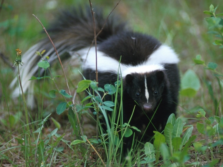 Skunk americký zvaný také skunk smrdutý je velký zhruba jako jezevčík a je černobíle zbarvený. Výrazné a nápadné dva bílé pruhy na zádech dávají najevo: Nemusím se schovávat, pozor na mě, umím se účinně bránit! A skutečně.