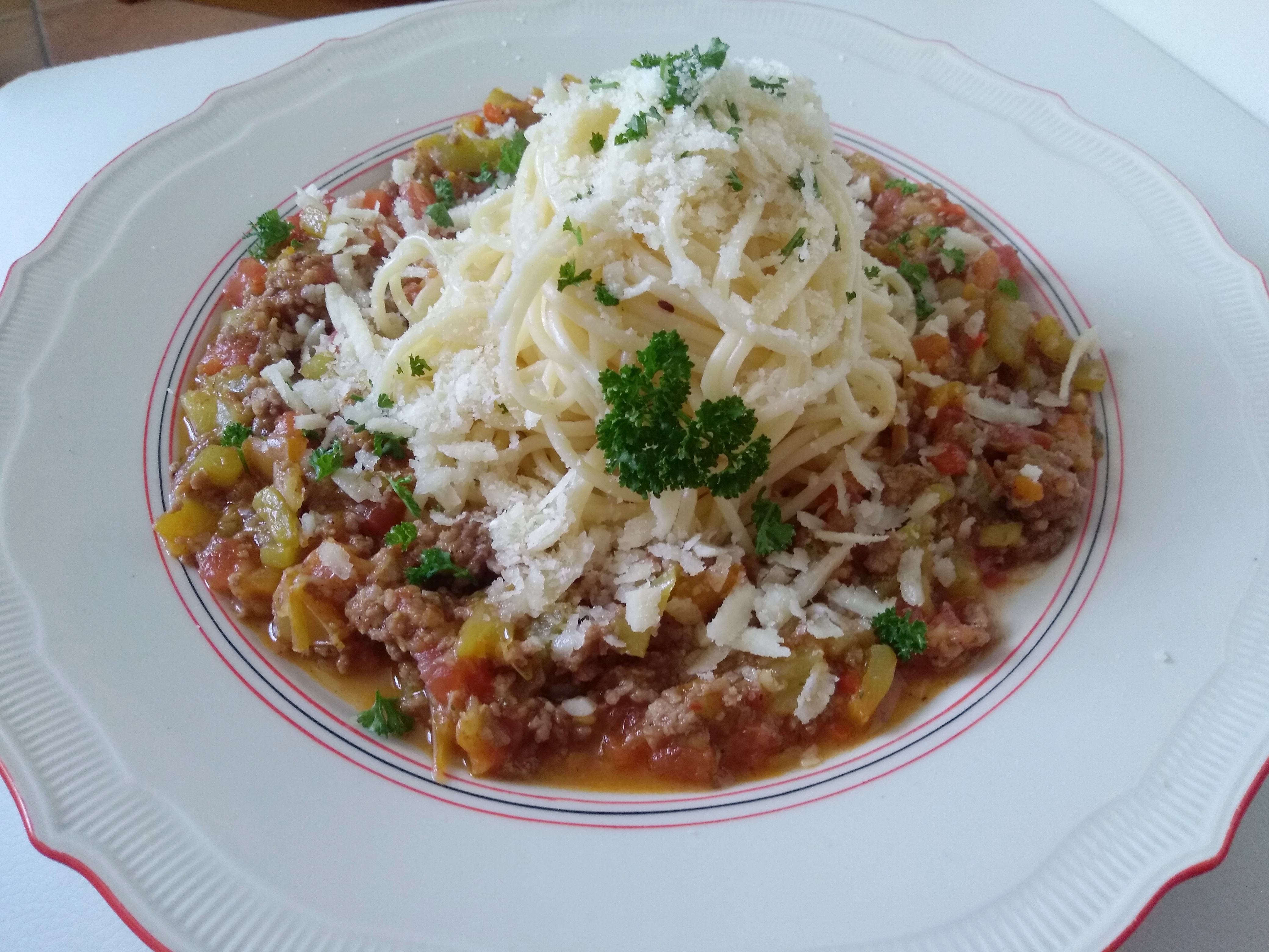 Podle návodu dáme vařit špagety a než se uvaří, připravíme omáčku. Na oleji zpěníme nadrobno nakrájenou cibuli a mleté maso na ni zprudka orestujeme. Přidáme očištěnou a na nudličky nakrájenou papriku a na kostičky nakrájenou oloupanou cuketu, zbavenou semínek. Přikryté poklicí dusíme 10 minut.