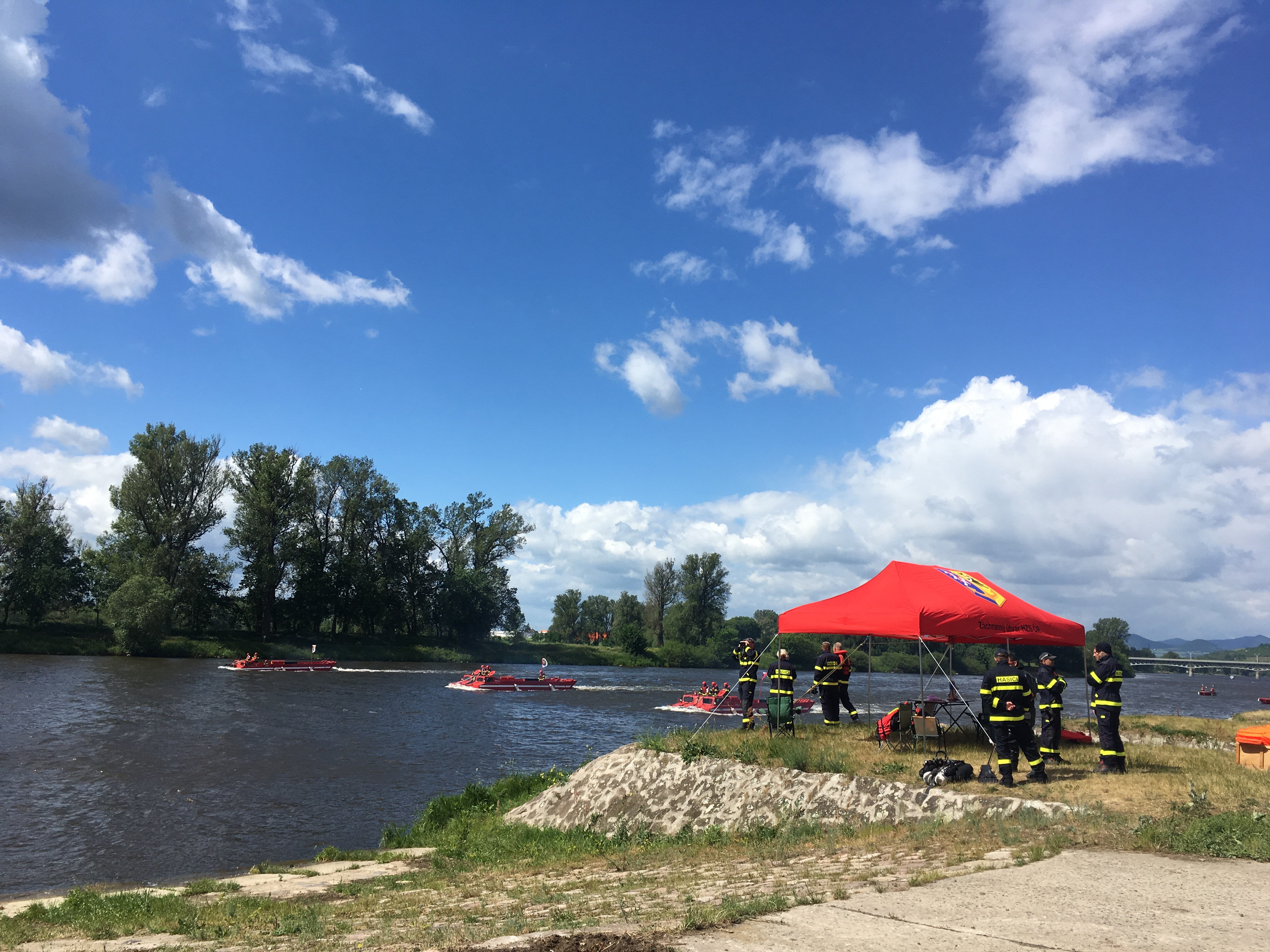 „Máme tady obojživelné pásové transportéry PTS 10, které mají přepravní kapacitu až 70 osob. Dnes zkoušíme jejich plavbu ve formaci, abychom uměli i v proudu a větru, který tu dnes je, udržet lajnu a budeme s nimi zkoušet i záchranu osob,“ popisuje David Kareš, zástupce velitele Záchranného útvaru hasičů České republiky a dodává: „Máme tady asi 40 kusů techniky, to znamená poměrně velký odřad.“