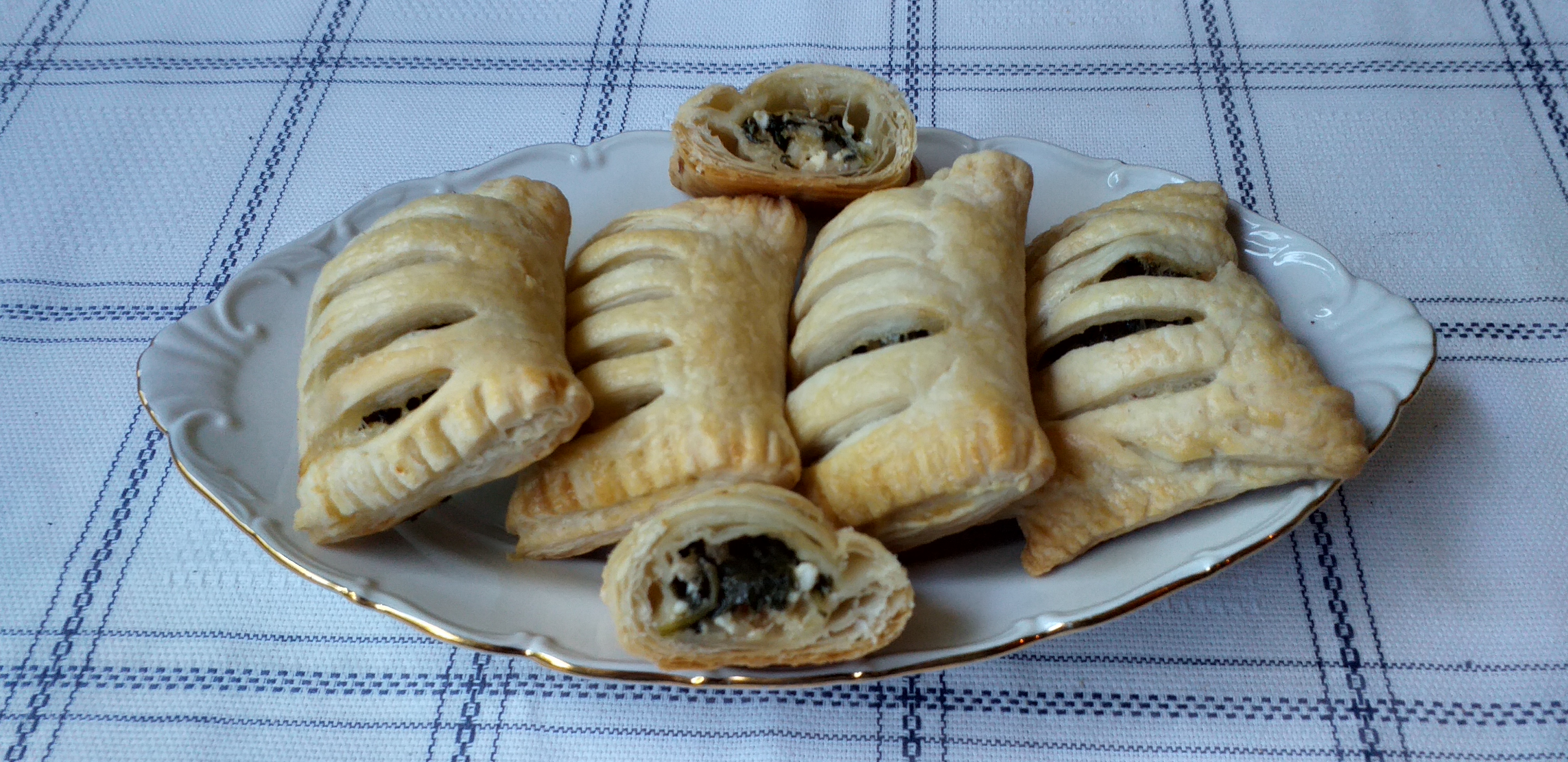- Zatímco špenát chladne, rozválíme listové těsto, rozkrájíme ho na obdélníky a na polovině každého obdélníku uděláme ostrým nožem několik zářezů.