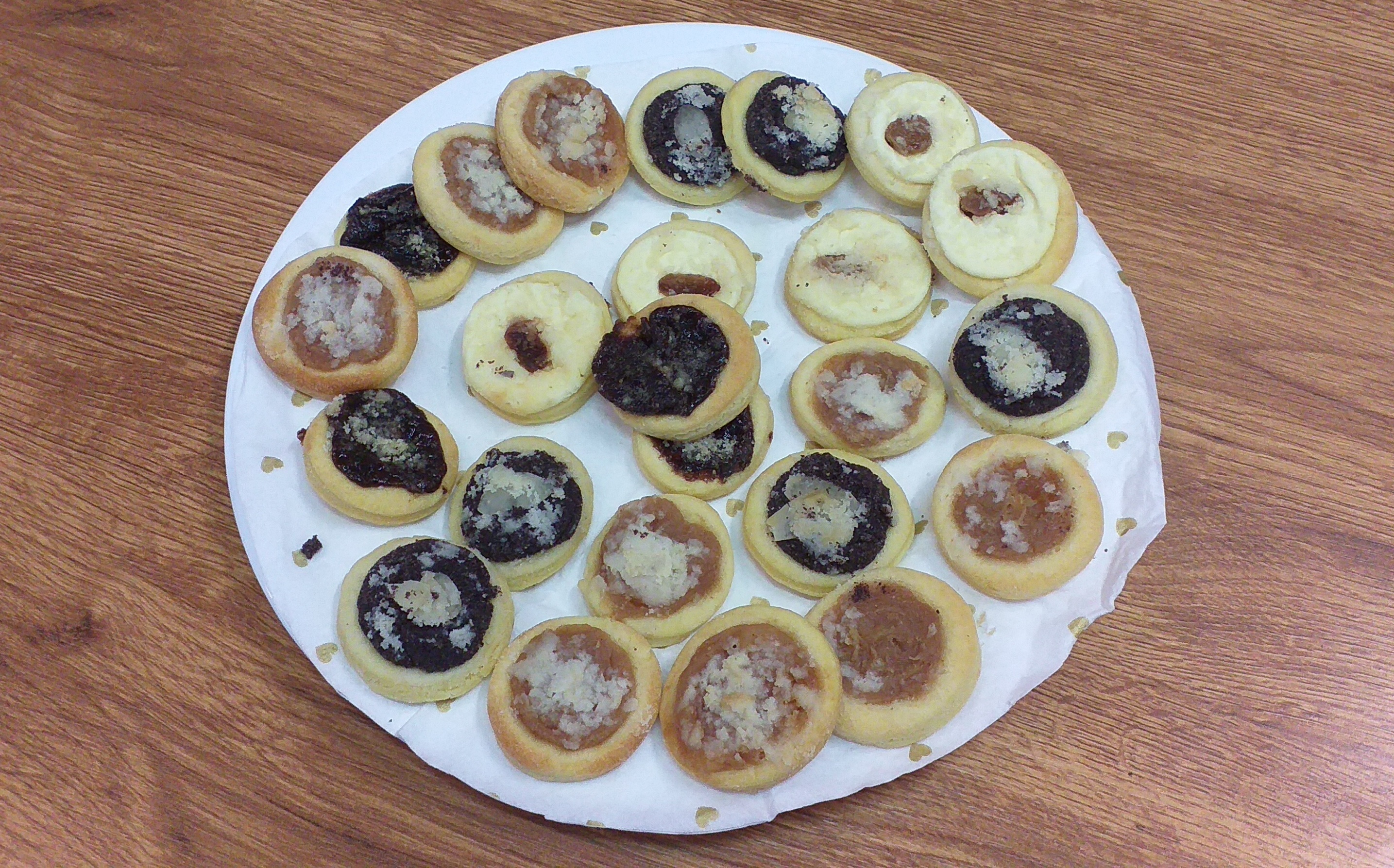 - Základy koláčků klademe na plech vyložený pečicím papírem, plníme podle chuti, do tvarohové náplně položíme rozinku, makovou nebo jablečnou náplň ještě dozdobíme drobenkou.