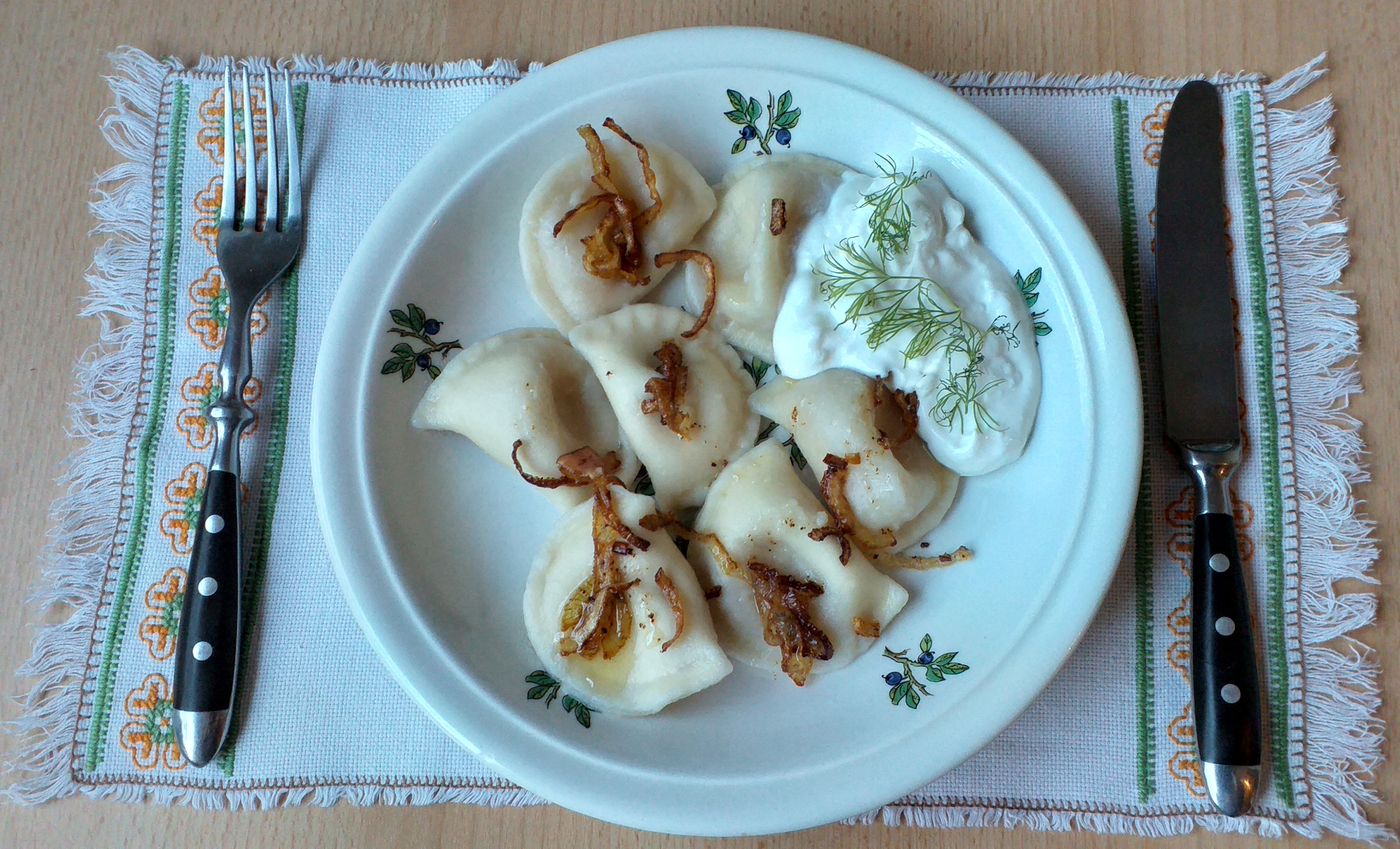 - Taštičky rozdělíme na talíře, posypeme osmaženou cibulkou a doplníme ochucenou smetanou.