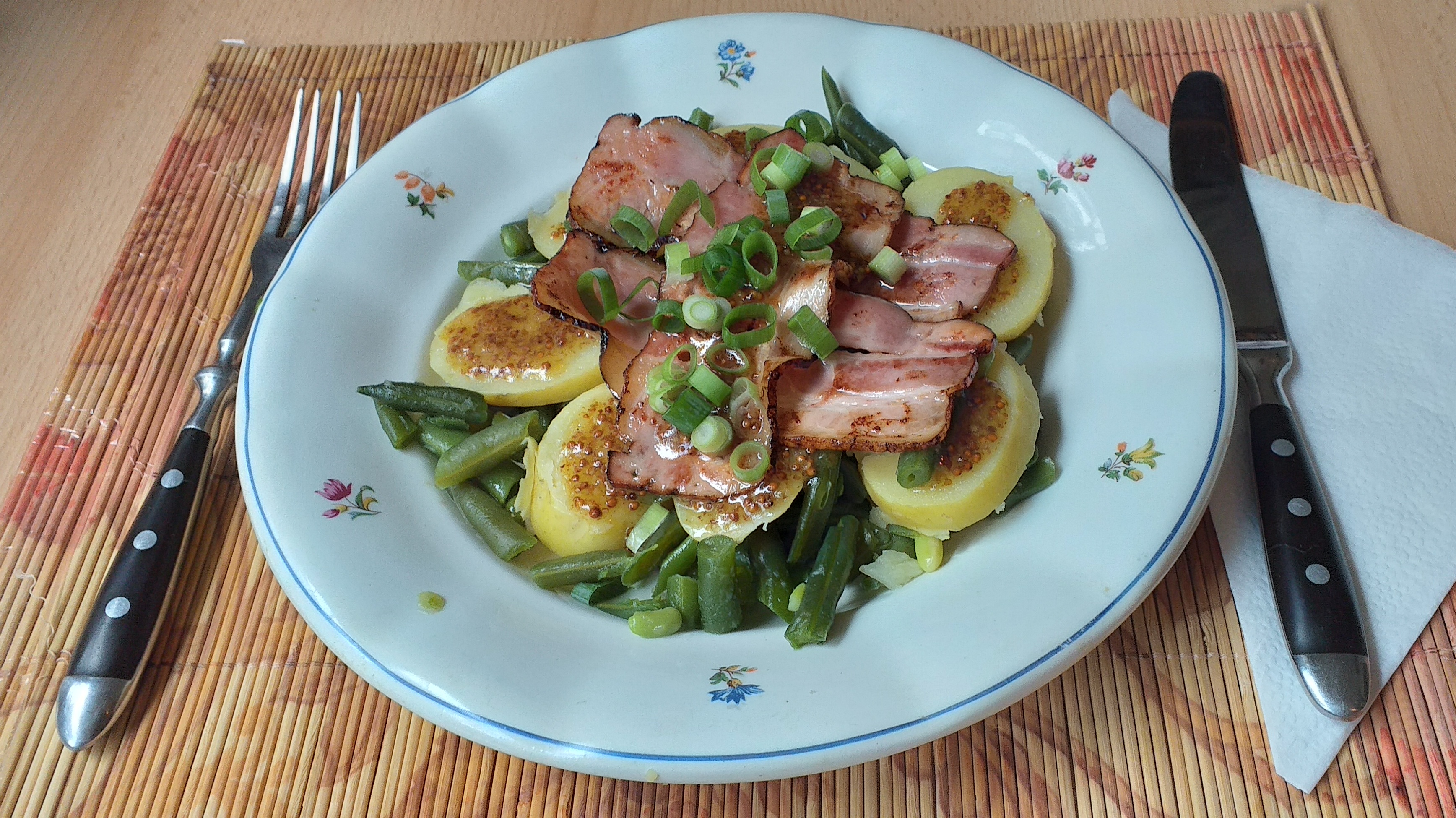 - Na talíře rozdělíme uvařené lusky, plátky z brambor, zakapeme dresinkem a ozdobíme rozpečenou slaninou, na povrch nasypeme zelenou část nakrájené lahůdkové cibulky.
