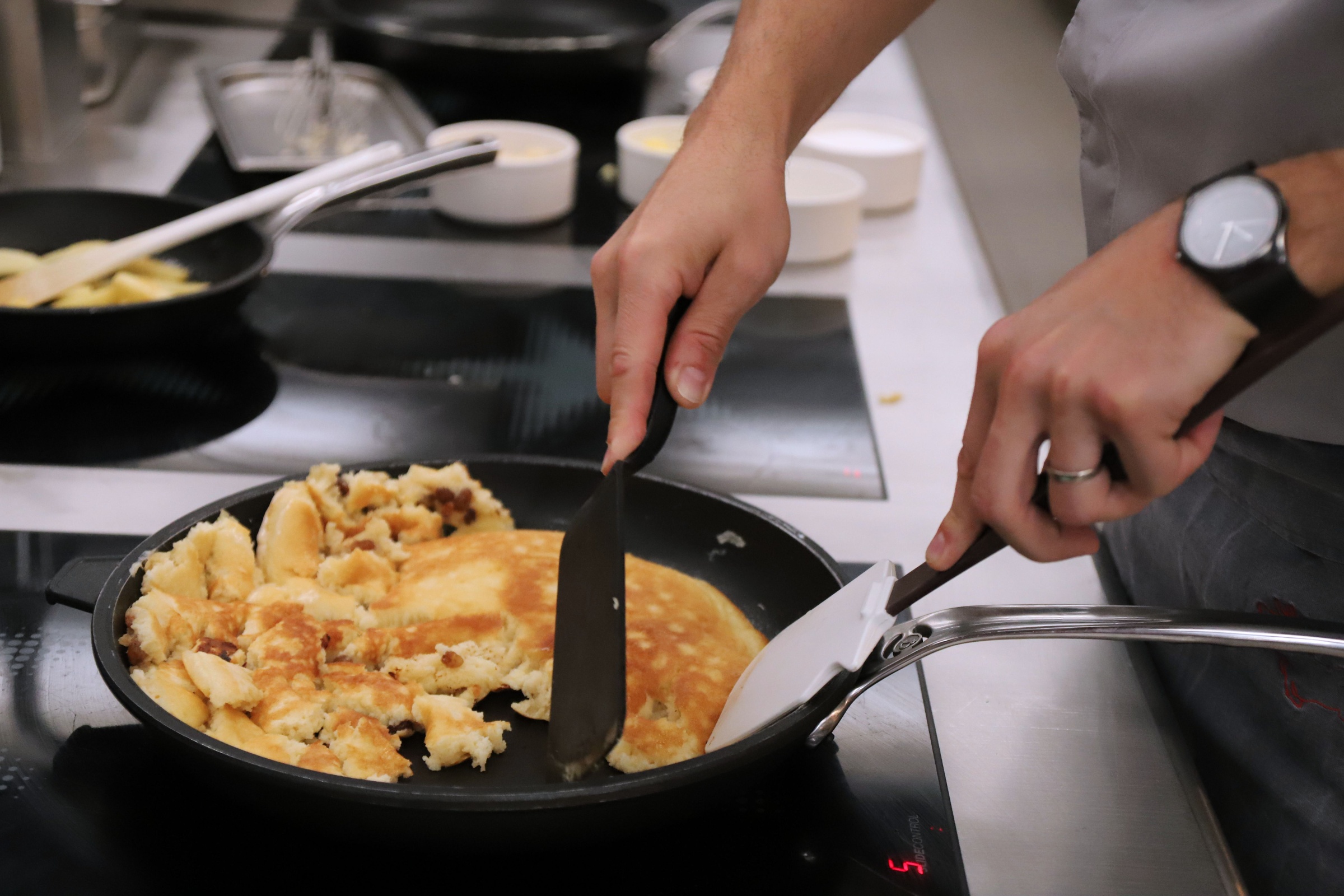 - Obraťte, spodní část nechte opět opéct a pak omeletu natrhejte hranou obracečky.