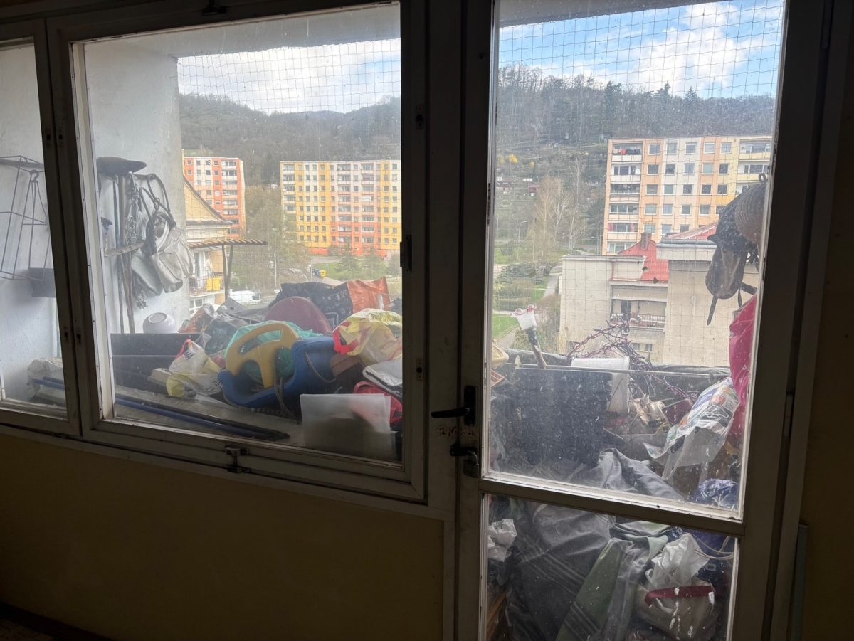 Při kontrole prvního vchodu nízkého panelového domu v Husově ulici se vrchní inspektorka Žaneta Švecová se zastavuje u balkonu v mezipatře – je zarovnaný až nad zábradlí různými věcmi.